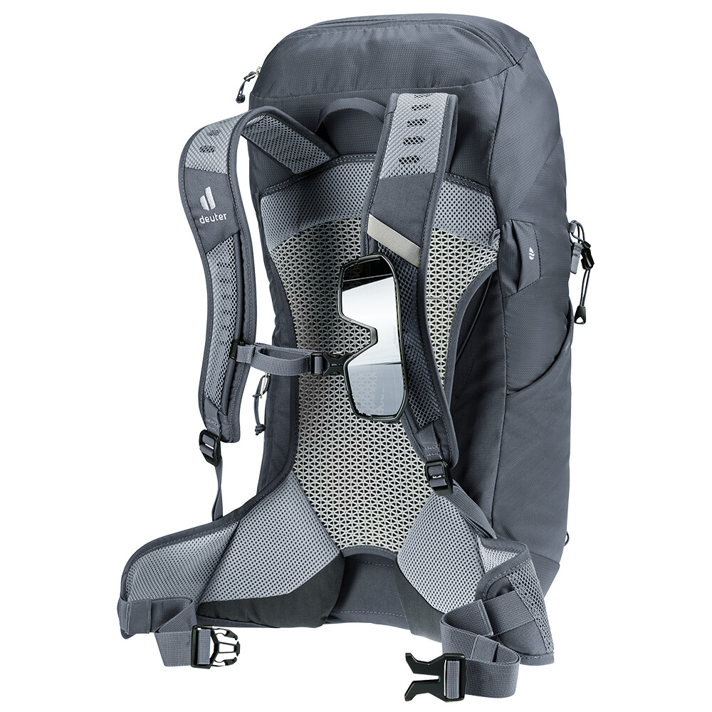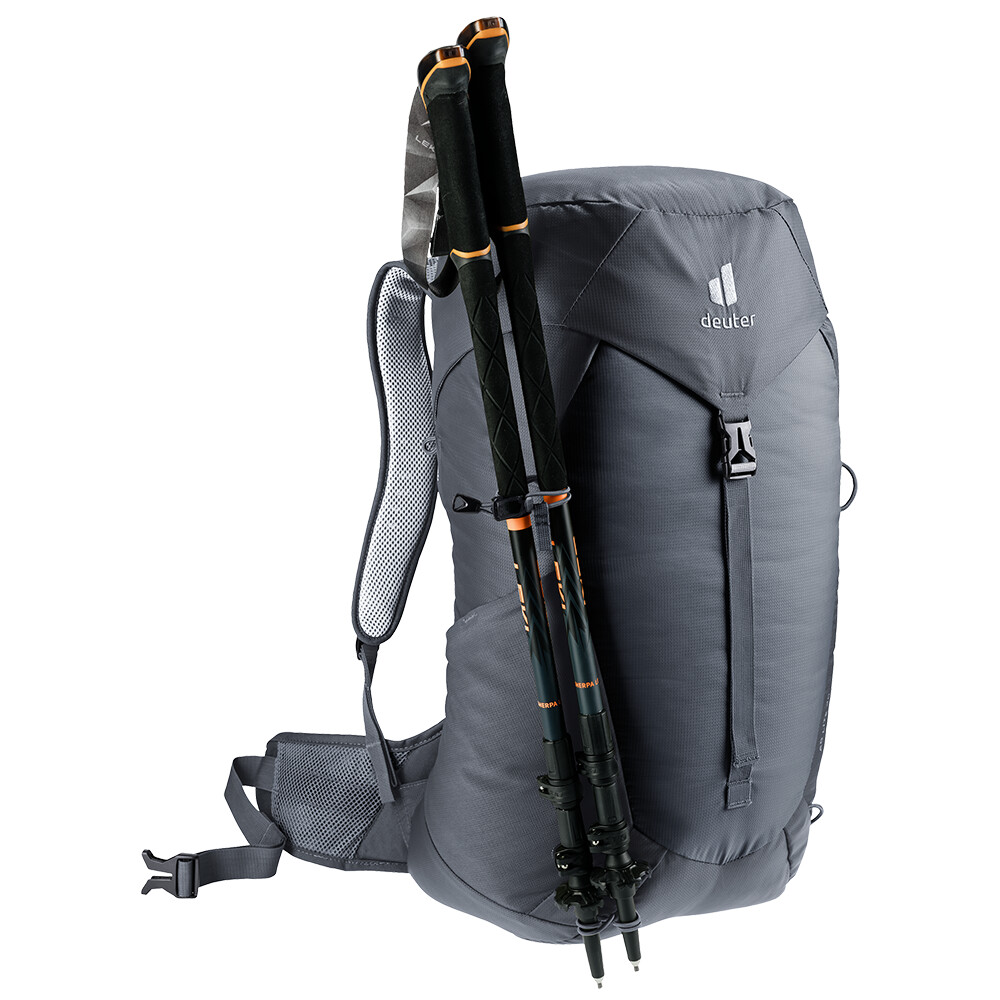 Există o mulțime de spațiu pentru tot ce aveți nevoie în camera spațioasă a modelului AC Lite 30. Centura de talie ergonomică căptușită este aerisită și se așează frumos pe șolduri și nu strânge. În plus față de buzunarul central, alte opțiuni de depozitare includ, printre altele, un buzunar pentru telefonul mobil sau alte obiecte de valoare și electronice, un compartiment pe capacul rucsacului sau bucle externe pentru echipament pe care le puteți folosi, de exemplu, pentru o jachetă sau alte lucruri esențiale. Pe părțile laterale veți găsi buzunare cu plasă pentru sticla dvs. de apă. Există, de asemenea, bucle pentru un suport pentru cască și pentru atașarea unui baston de trekking. Pe cureaua de umăr veți găsi o buclă pentru atașarea ochelarilor. Acest lucru face din AC Lite 30 partenerul ideal pentru drumeții de toate tipurile.