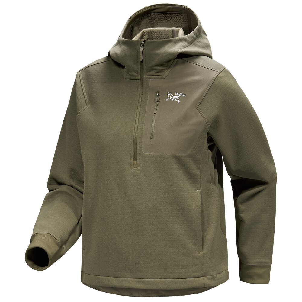 Hanoracul Aestas Pullover Hoody de la Arc´teryx este un hanorac cu fermoar scurt pentru femei, fabricat din țesătură Polartec® Power Air™ Hardface®. Această țesătură se caracterizează prin moliciune, căldură și rezistență la pilling. Suprafața netedă a țesăturii sporește durabilitatea și este confortabilă la stratificare. Gluga cu profil redus oferă căldură și se potrivește sub cască. Hanoracul are buzunare pentru mâini și un buzunar cu fermoar pe piept pentru obiecte mici. Cusăturile umerilor poziționate dinamic îmbunătățesc libertatea de mișcare și nu apasă sub curelele rucsacului.