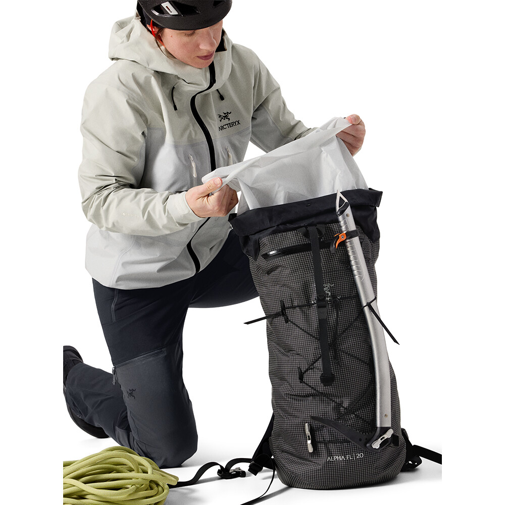 O versiune mai mică a rucsacului Alpha FL de la Arcteryx. Rucsacul este conceput pentru alpinism minimalist și pentru fanii alpinismului pe stâncă, gheață și alpinism. Țesătura specială HADRON AC2 de la Arcteryx oferă o durabilitate de neegalat pentru greutatea sa. Rucsacul cântărește doar 635 g și este rezistent la apă. Are curele de umăr ușor căptușite și toate închiderile sunt perfect de operat chiar și cu mănuși. Închiderea este rezolvată de un capac rulant cu cataramă, iar datorită manșonului de extensie de sub capac puteți crește cu ușurință capacitatea întregului rucsac.