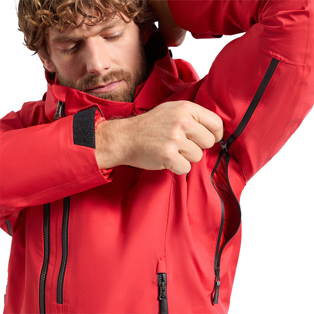 GORE-TEX Performance are o rezistență ridicată la degradarea mecanică și chimică. Își păstrează proprietățile pentru o perioadă lungă de timp atunci când este depozitat corect. Coloana de apă foarte ridicată vă protejează împotriva apei chiar și atunci când traversați munții timp de mai multe zile în ploaie. Jacheta Alpine Guide GTX Performance este concepută pentru condiții extreme. Îți păstrează în mod fiabil microclimatul și căldura prețioasă chiar și în cazul unei umidități ambientale ridicate sau al unor vânturi foarte puternice. Capota complet reglabilă cu guler înalt face aproape imposibilă pătrunderea vânturilor neplăcute. Mânecile și tivul sunt prevăzute cu cordon de strângere și nu vor zbura. Capota este compatibilă cu casca. Jacheta are o croială sofisticată care nu restricționează mișcarea. Partea de jos a jachetei nu se va strânge chiar și atunci când urcați. Cinci buzunare sporesc caracterul practic al jachetei. Cele două buzunare laterale sunt amplasate mai sus și nu interferează cu utilizarea centurii de siguranță sau a centurii taliei. În timpul activităților mai active, puteți scăpa de excesul de căldură cu ajutorul fermoarelor de ventilație de la subsuori. Completați această jachetă cu un strat intermediar tehnic și maximizați confortul în toate condițiile.