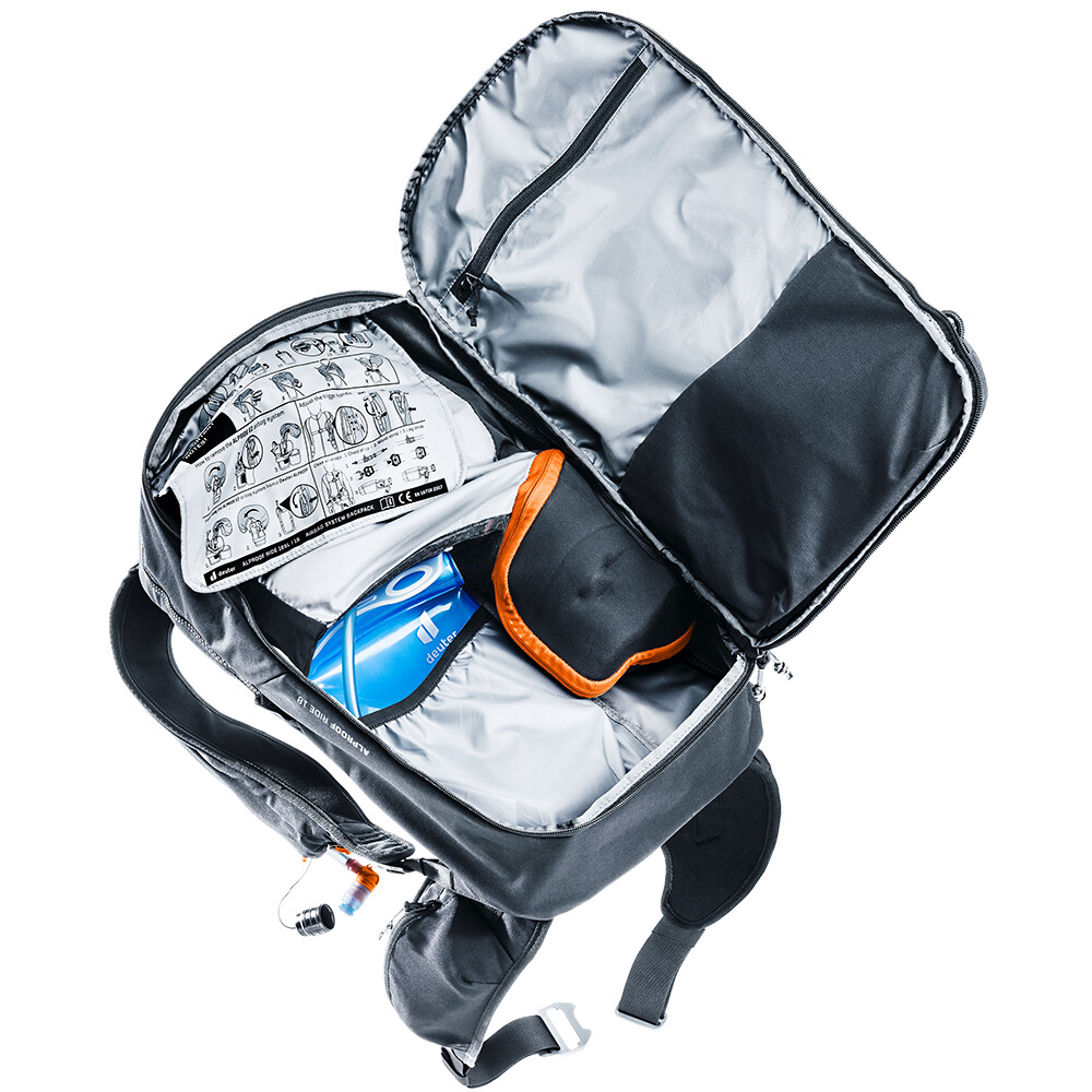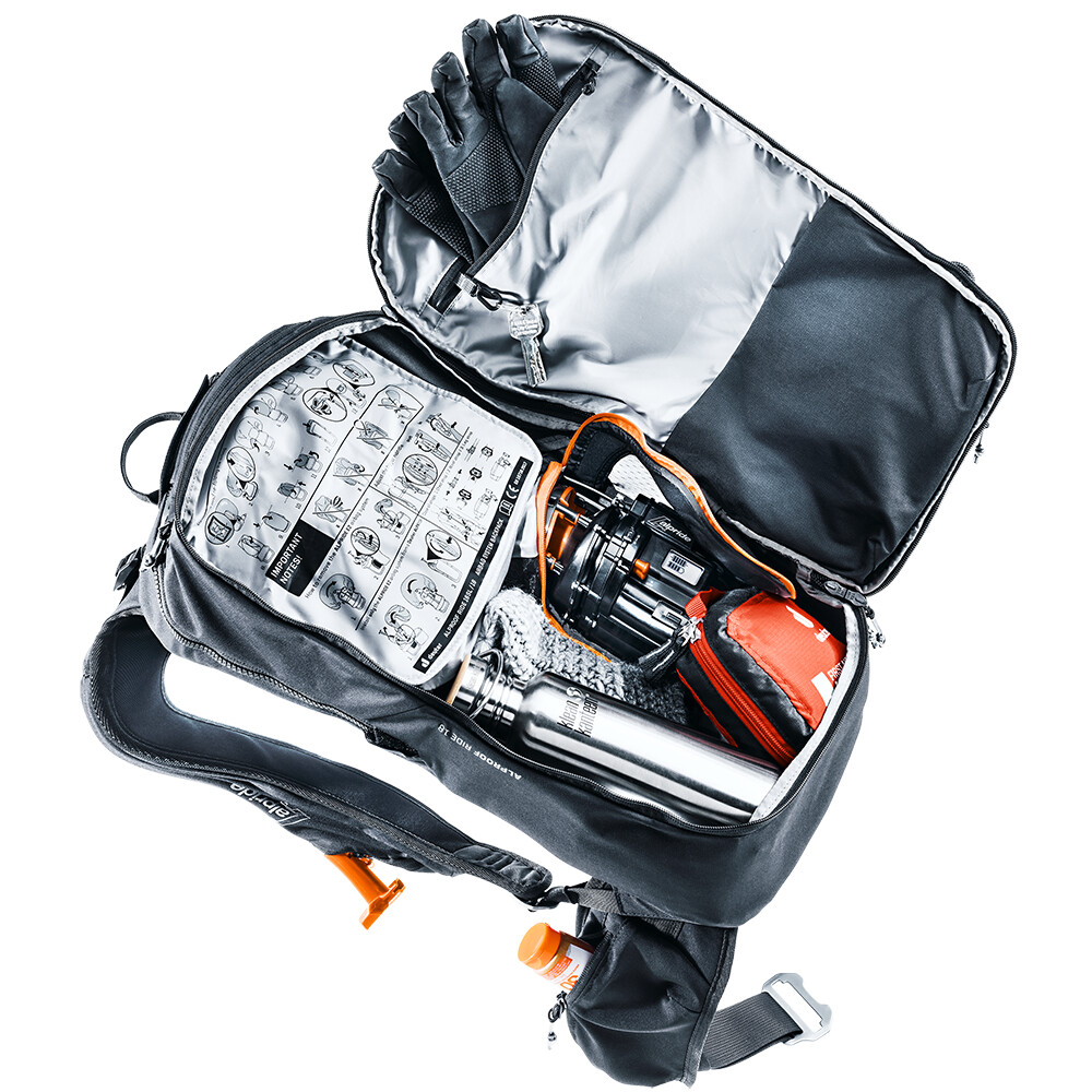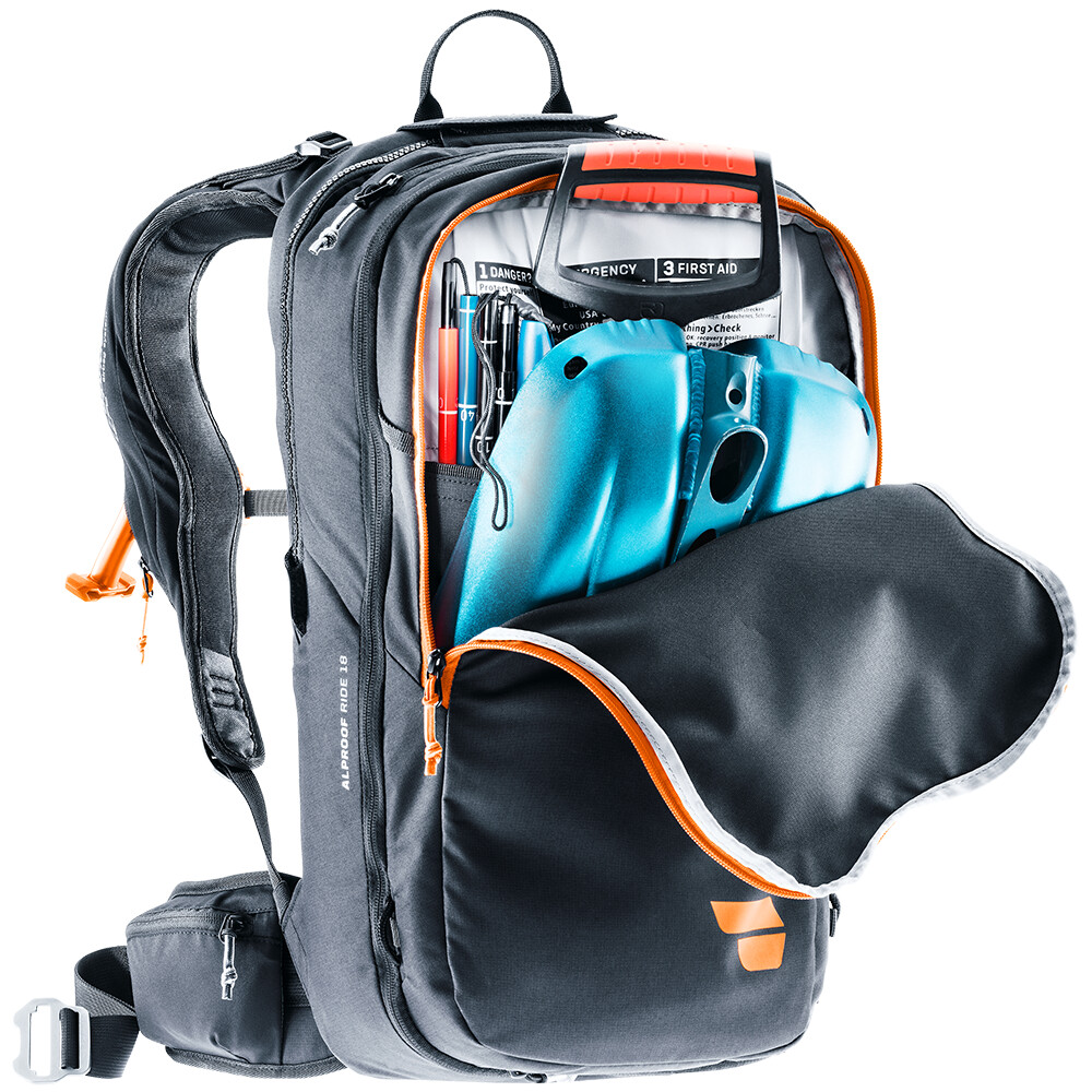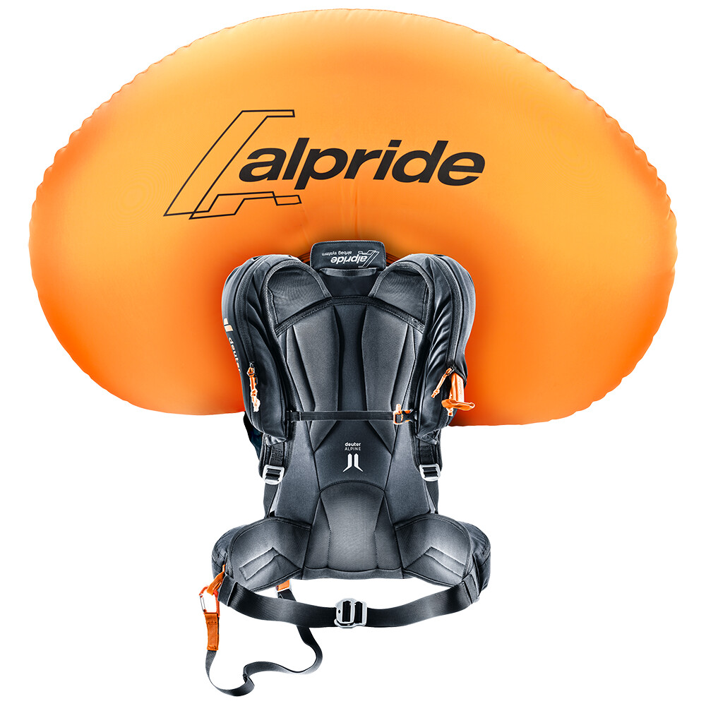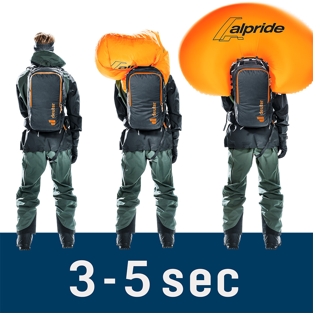 Rucsacul Alproof Ride de la deuter este special conceput pentru pasionații de schi și snowboarding freeride și freestyle. Are un volum mai mic, forma sa nu restricționează mișcarea și, incluzând airbagul de avalanșă, cântărește 2600 g. Airbag-ul este electronic și poate fi încărcat prin cablu USB-C sau funcționează cu două baterii AA. Are un indicator al stării de încărcare direct pe dispozitivul electronic și, de asemenea, extern, pe centura de talie, pentru verificarea ușoară a partenerului. Funcționează fiabil chiar și la temperaturi de îngheț de până la -30°C. Rucsacul este, de asemenea, echipat cu o curea de siguranță care se fixează peste picior la centura de talie, astfel încât să rămână întotdeauna pe spate în cazul unei avalanșe.
