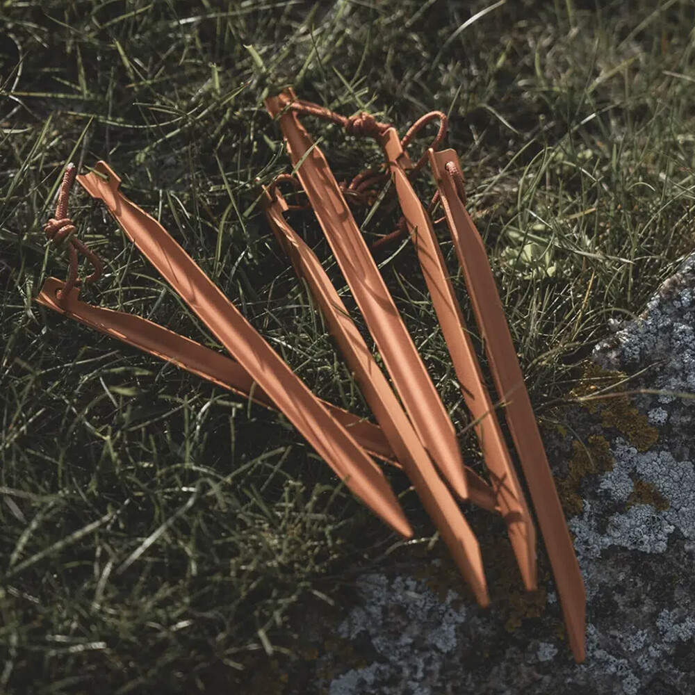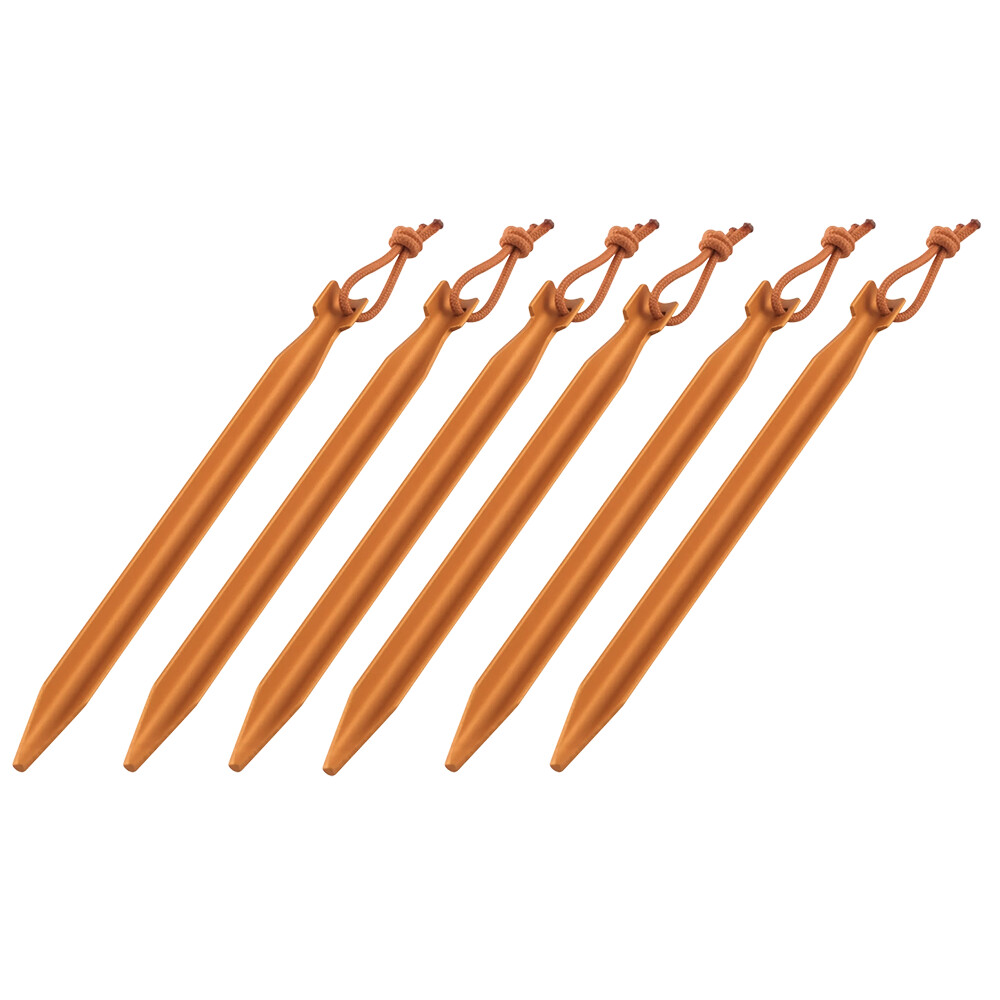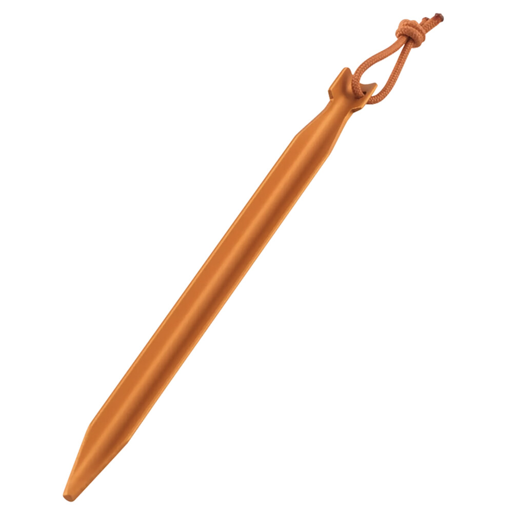 țărușii Easy Camp Aluminium V-Pegs sunt concepuți pentru a vă ancora în siguranță cortul, prelata sau adăpostul chiar și în terenuri dure, stâncoase sau mixte. Cu o formă în V și un profil plat, acestea oferă o aderență mai bună în sol decât țărușii rotunzi standard și sporesc stabilitatea ancorării. Cuiele sunt fabricate din aluminiu 6061 durabil, asigurând o greutate redusă, precum și o rezistență suficientă pentru utilizarea repetată. Culoarea portocalie le crește vizibilitatea în iarbă sau pe sol, iar o buclă la îndemână în partea de sus le face ușor de scos atunci când le împachetați.