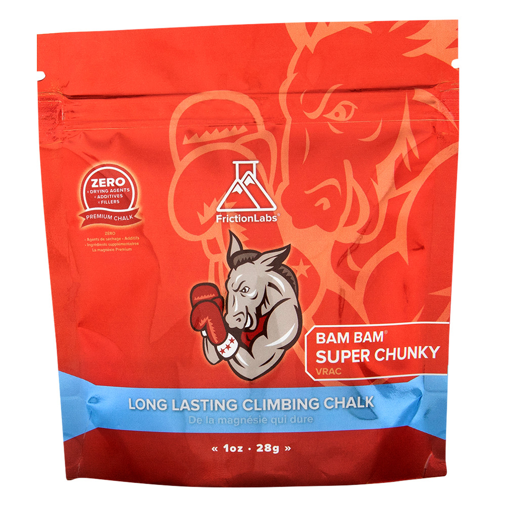 Magneziul Bam Bam este măcinat sub formă de pepite de mărimea unui strugure până la o minge de golf. Textura ideală pentru cei cărora le place senzația de zdrobire a magmei între degete. Acest lucru permite magneziului să ajungă mai adânc în piele. Mago Frictionlabs este foarte eficient deoarece conține doar carbonat de magneziu foarte pur.