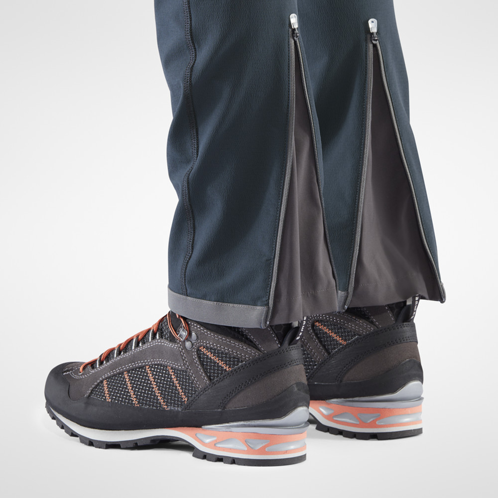 Țesătura elastică durabilă dublu țesută este respirabilă și nu limitează mișcarea. Designul este deliberat simplu pentru a menține confortul de mișcare și a nu complica utilizarea hamului de alpinism. Toate buzunarele cu fermoar pentru picioare sunt din plasă pentru a servi ca ventilație pentru reglarea temperaturii. Partea din spate elastică la nivelul taliei permite o gamă mai largă de mișcări. Capetele picioarelor cu burdufuri cu fermoar vor găzdui, de asemenea, o cizmă de ski touring.