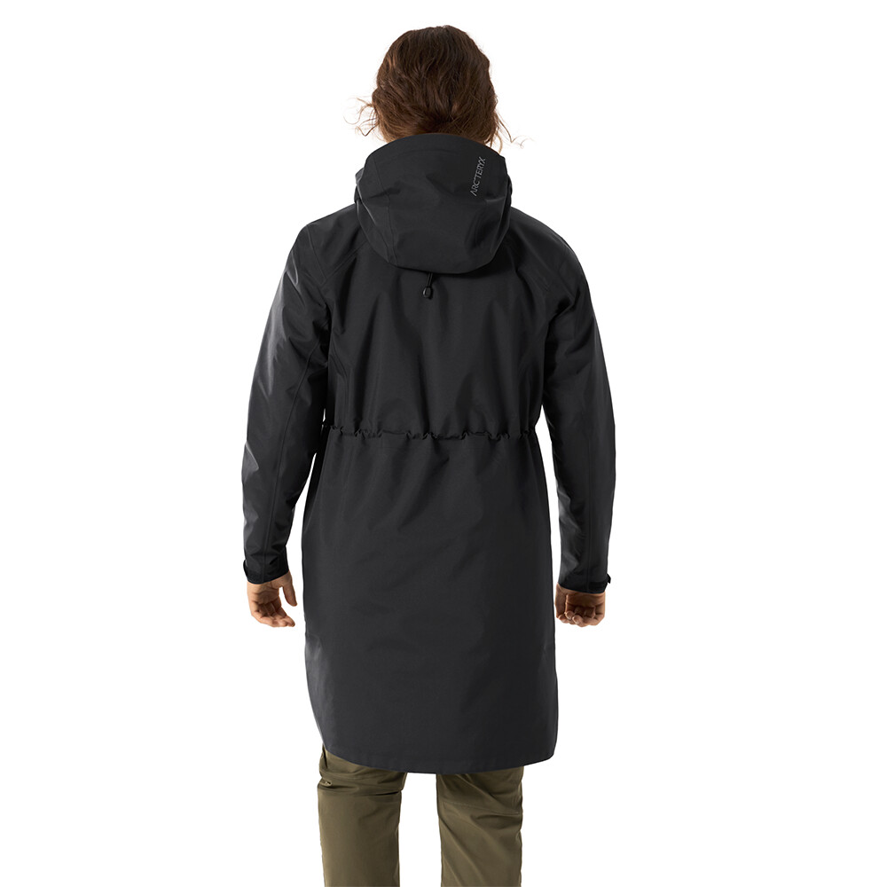Gore-tex 3L rezistent la vânt și la apă protejează în condiții meteorologice nefavorabile. Capota reglabilă cu guler ergonomic se potrivește și protejează perfect. Fermoarul bidirecțional hidrofug permite îmbrăcarea ușoară și reglarea temperaturii. Buzunarele spațioase cu fermoare bidirecționale sunt apreciate pentru caracterul lor practic. Haina poate fi strânsă în talie pentru a accentua formele feminine.