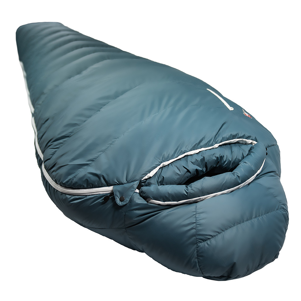 Sac de dormit pentru trei anotimpuri cu umplutură combinată din pană de rață și lână. Acest lucru îl face rezistent la umiditate, ușor și foarte confortabil termic.