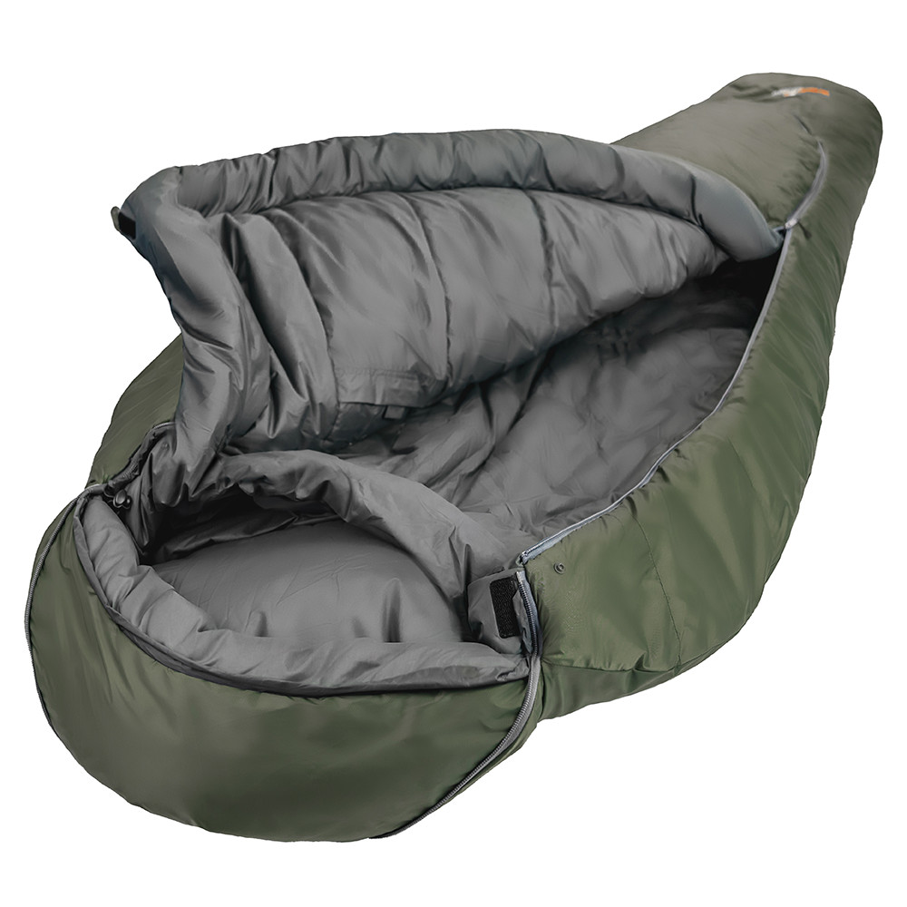 Sac de dormit pentru trei anotimpuri cu umplutură combinată din pană de rață și lână. Acest lucru îl face rezistent la umiditate, ușor și foarte confortabil termic.