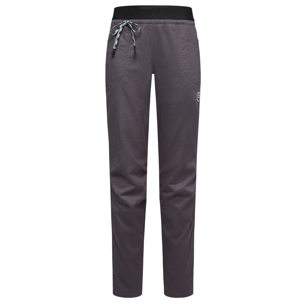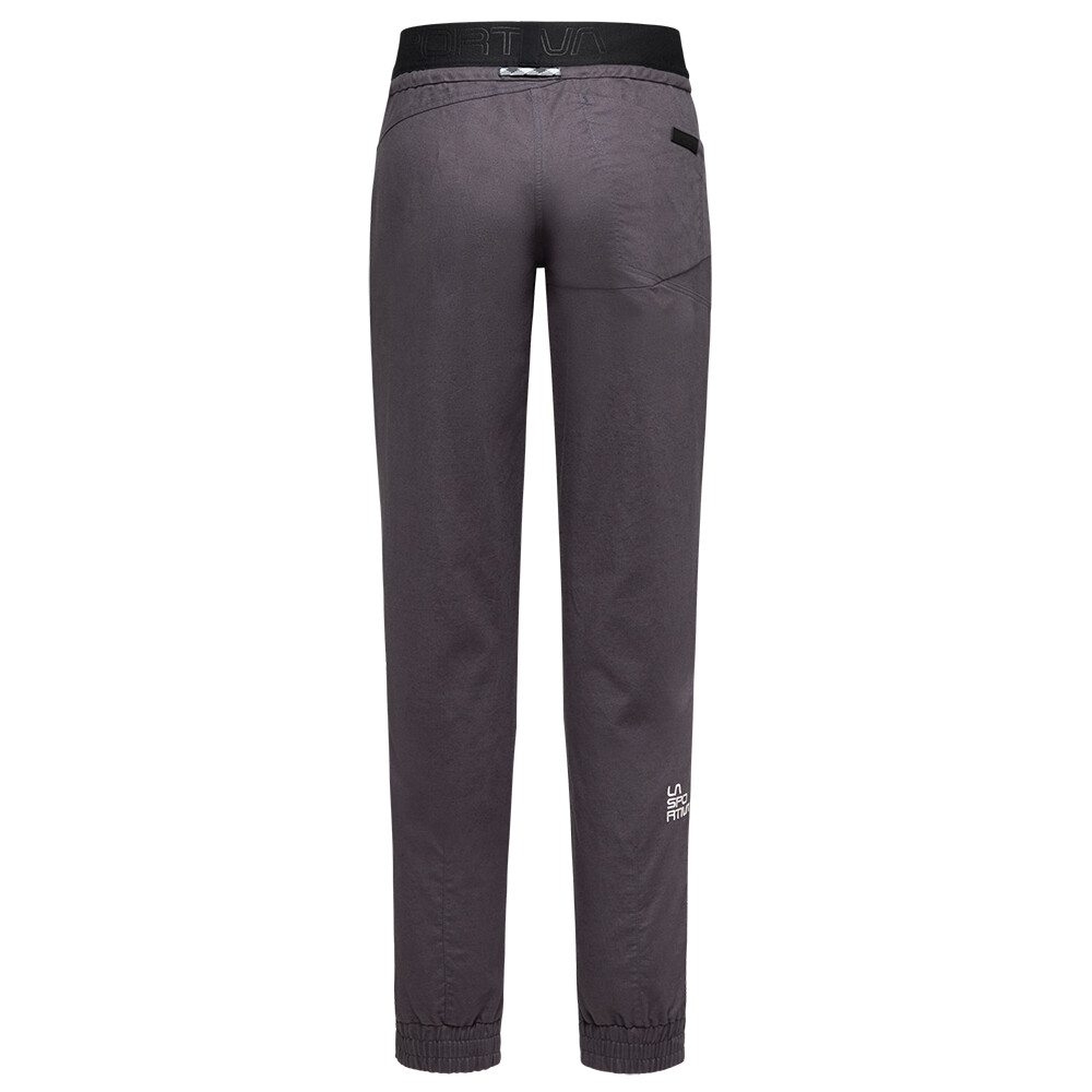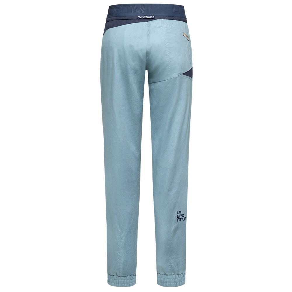 Pantalonii sunt confecționați din bumbac organic, cânepă și elastan. Acest lucru face ca pantalonii să fie moi, respirabili și elastici. Croiala sportivă pentru femei cu talie plată este ideală pentru a fi combinată cu un ham de alpinism. Pantalonii oferă un număr mare de buzunare, inclusiv un buzunar pentru periuța de dinți și un buzunar pentru telefonul mobil. Croiala cu genunchi preformați se potrivește perfect și nu restricționează mișcarea. O buclă pentru atașarea unei pungi magnum este, de asemenea, un detaliu frumos.