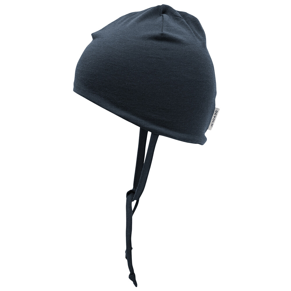 Pălărie ușoară și respirabilă Breeze Baby Beanie de la compania norvegiană Devold, cu o cravată sub bărbie. Este fabricată din 100% lână Merino.