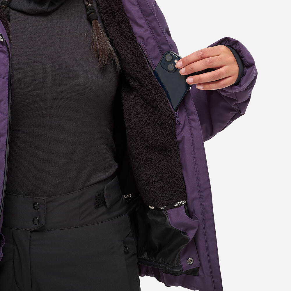 În plus față de buzunarele de mână, jacheta are un buzunar intern cu fermoar pentru obiecte mici și un buzunar din plasă pentru depozitarea ochelarilor, complet cu un șervețel. Buzunarul pentru skipass nu poate fi ratat; acesta este ascuns pe antebrațul stâng. O altă parte esențială a jachetei este gulerul de zăpadă cu centură antiderapantă. Mânecile sunt finisate cu o manșetă elastică foarte confortabilă.