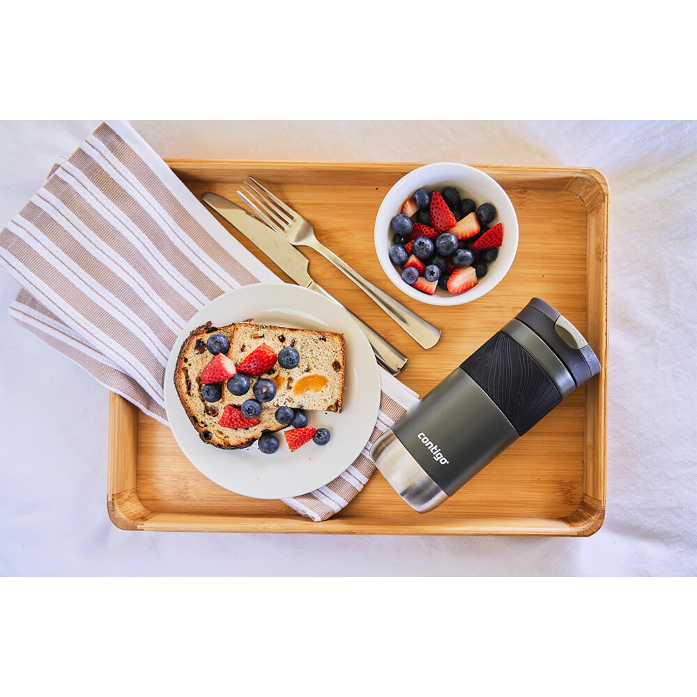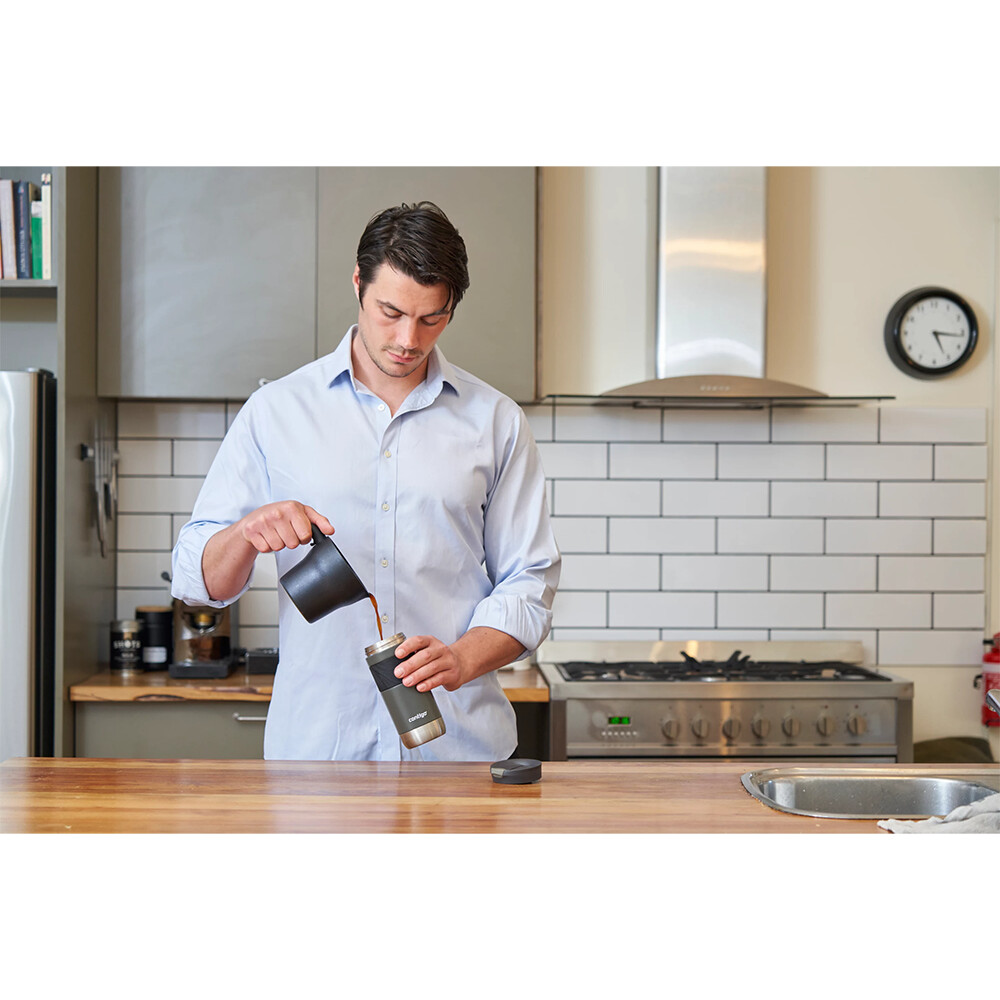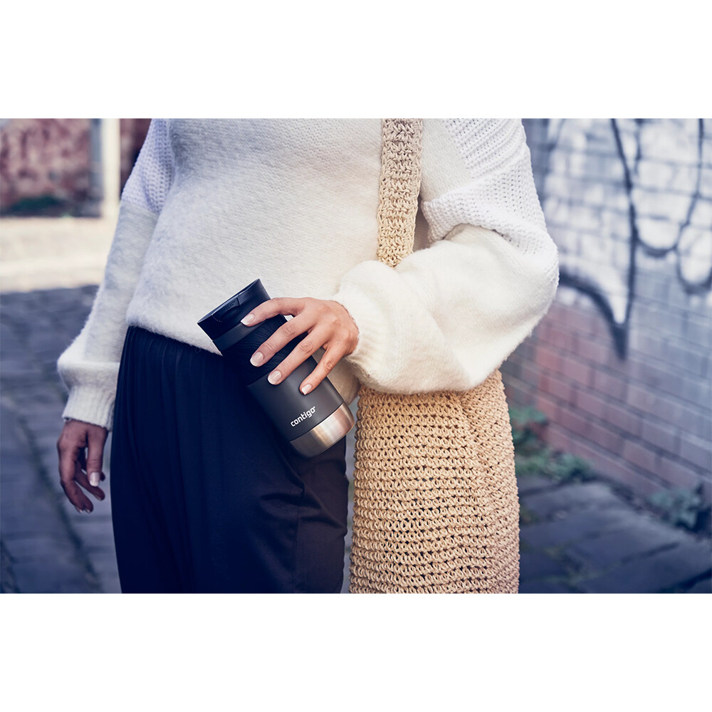 Cana termo din oțel inoxidabil cu pereți dubli de la Contigo vă va impresiona cu designul și funcționalitatea sa. Păstrează băuturile la temperatura dorită pentru o perioadă lungă de timp, fierbinte timp de 6 ore, rece timp de 12 ore. Datorită tehnologiei patentate Snapseal, cu o singură apăsare luați o înghițitură și prin apăsare lichidul este imediat blocat din nou în siguranță. Acest lucru face ca cana să fie perfectă pentru călătoriile zilnice, deoarece o puteți "arunca" în siguranță în rucsac sau vă puteți savura cafeaua de dimineață în timpul călătoriilor cu mașina și autobuzul.