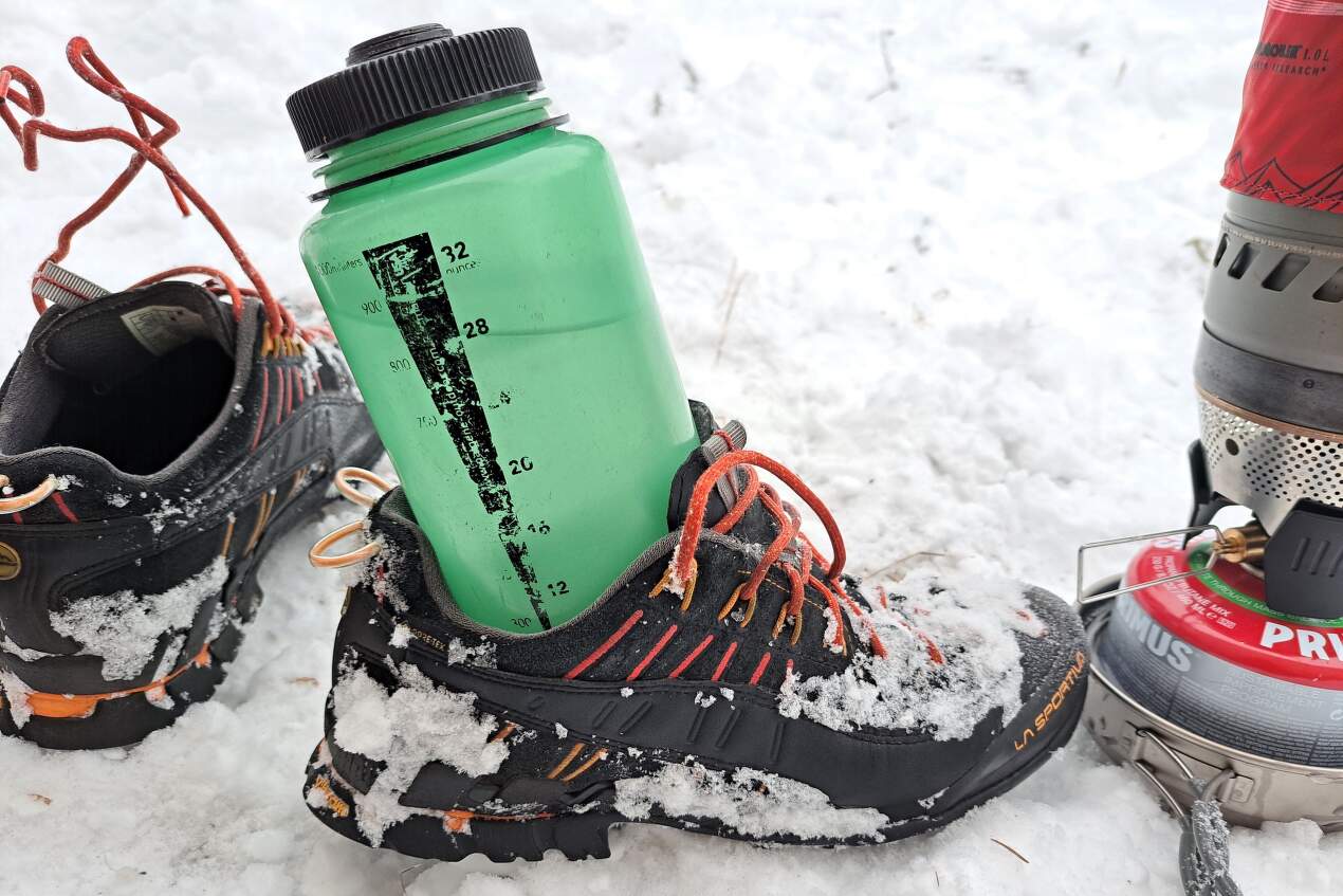Cizmele după o noapte geroasă prezintă o altă problemă, care are din nou o soluție nalgene. Umpleți cu apă fierbinte, băgați cizmele indisciplinate în coș și lăsați până se dezgheață complet. Oricine s-a confruntat vreodată cu arsuri de piele înghețate până la piatră și cu șireturi ieșite ca niște sârme neclintite știe despre ce vorbim.