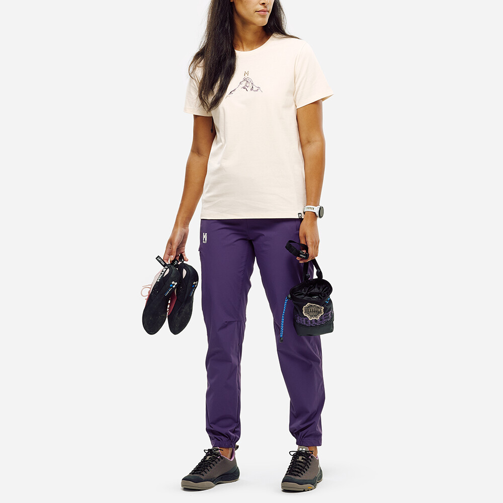 Pantalonii pentru femei CIMAI POLY PT de la Millet, confecționați din poliamidă reciclată, oferă confort maxim și libertate de mișcare la escaladă și pe teren muntos.