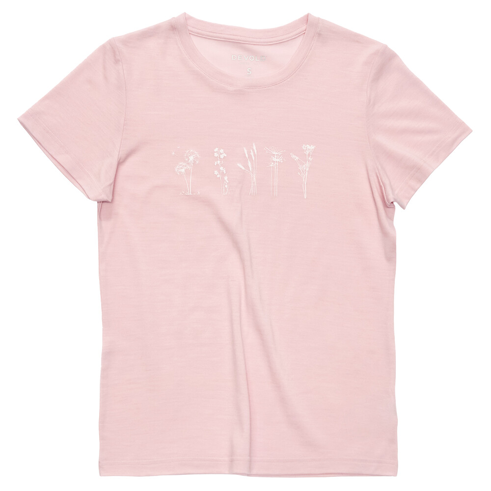 Tricou merinos pentru femei cu grafică de flori Classic Flowers Tee de la compania norvegiană Devold. Îl veți iubi pentru uzura zilnică pe tot parcursul anului. Material plăcut și croială confortabilă "Loose".