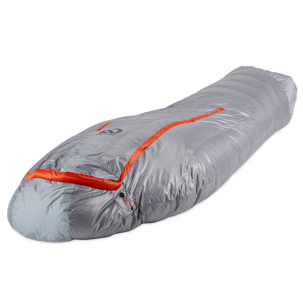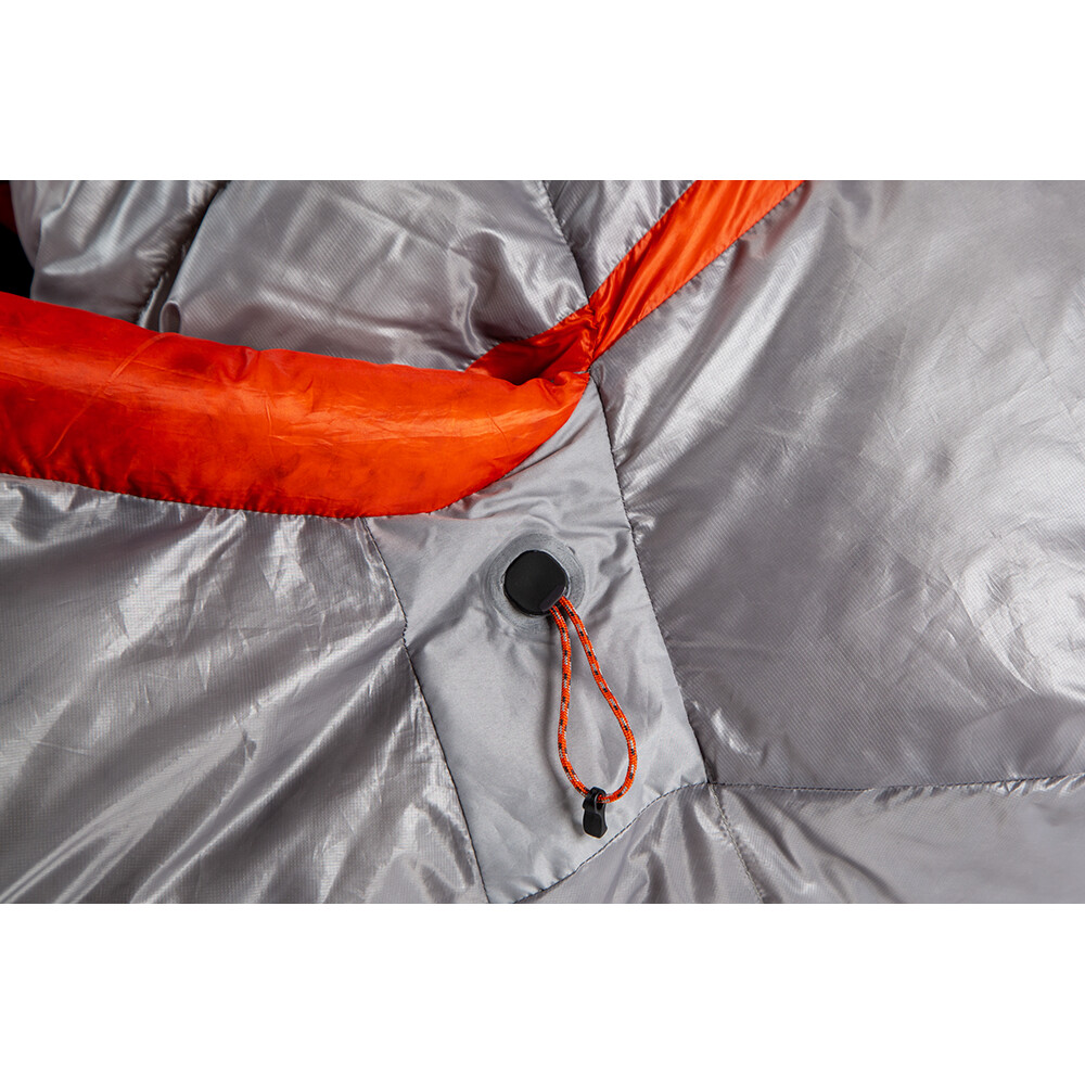 Sac de dormit din puf pentru drumeții în trei anotimpuri. Greutate redusă, puf de gâscă de înaltă calitate, închidere cu fermoar sau buton. Secțiune pentru picioare cu formă ergonomică și cordon pentru glugă cu o singură mână.