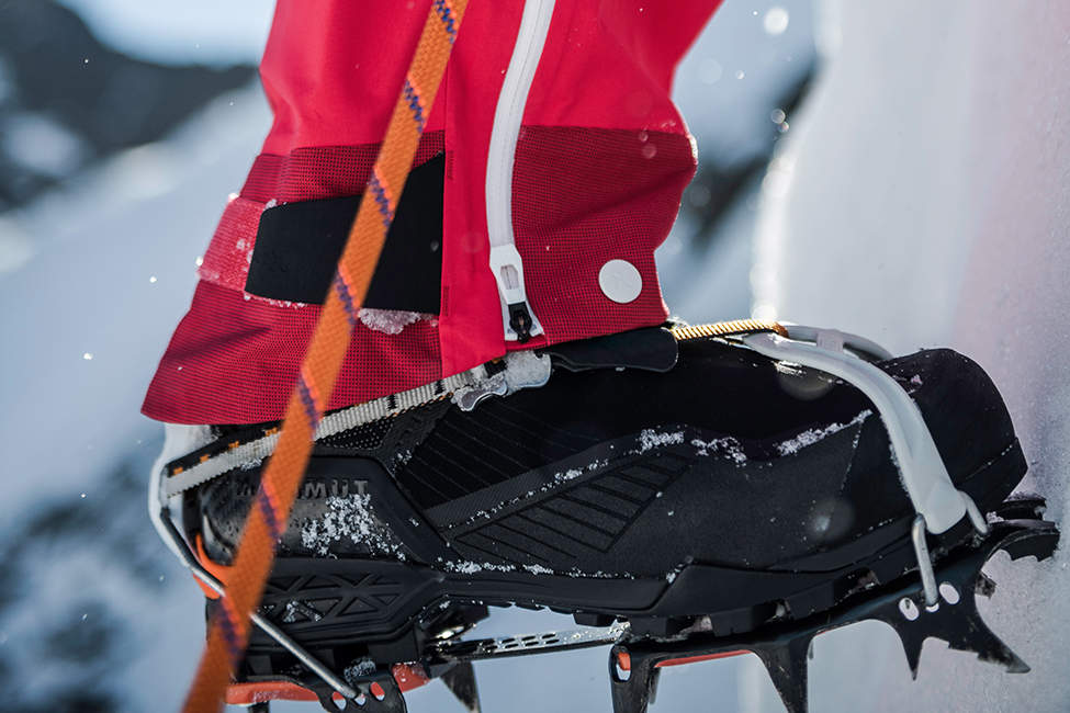 Încălțămintea de exterior pentru deplasarea cu crampoane trebuie să fie suficient de robustă, rigidă, cu fețe rezistente la abraziune. Bineînțeles, este esențială o rezistență excelentă la pătrunderea umezelii, adică cu o membrană impermeabilă. În gama noastră, această calitate este egalată de cizmele din categoria C și mai sus și, bineînțeles, de cizmele de schelet pentru alpinism sau schi alpinism. Categoric nu recomandăm cizme de trekking de vară mai moi și mai ușoare, chiar și cizme de gleznă, pentru mersul în crampoane.