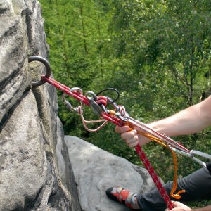 - Introduceți dispozitivul de rapel în toroanele de frânghie pregătite și conectați-l cu carabinierul la ochiul inferior din mijlocul praștiei de ancorare. Înșurubați dispozitivul de blocare a carabinierului (Figura 3).