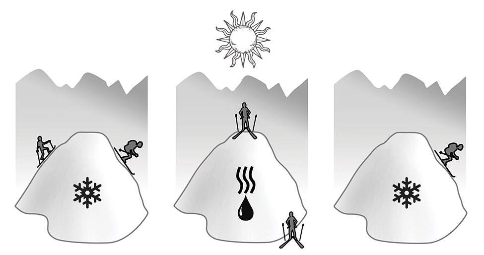 Repetați: Asigurați-vă în primul rând propria siguranță. Cu siguranță nu îi veți face fericiți pe salvatori dacă veți crește numărul de persoane îngropate sau rănite în timpul salvării! Lăsați UNUL dintre cei mai experimentați membri ai expediției să se ocupe de căutarea în avalanșă și de salvarea ulterioară. Pentru a accesa locul avalanșei, alegeți calea cu cea mai ușoară pantă și cu cel mai stabil strat de zăpadă. Când înaintați, respectați distanța de siguranță. Evitați zonele riscante, cum ar fi pantele abrupte, covoarele și moguli. Pe de altă parte, conducem drumul prin "insule de siguranță" sub forma unor înălțimi diferite, secțiuni împădurite etc.