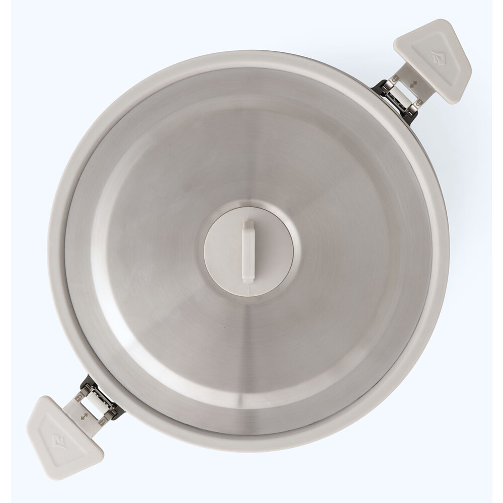 Oală pliabilă fabricată din oțel inoxidabil și silicon alimentar. Este perfect stivuibilă și ocupă un spațiu minim în rucsac. Are un mâner detașabil cu mecanism de blocare și o pâlnie pentru turnarea ușoară a excesului de apă.