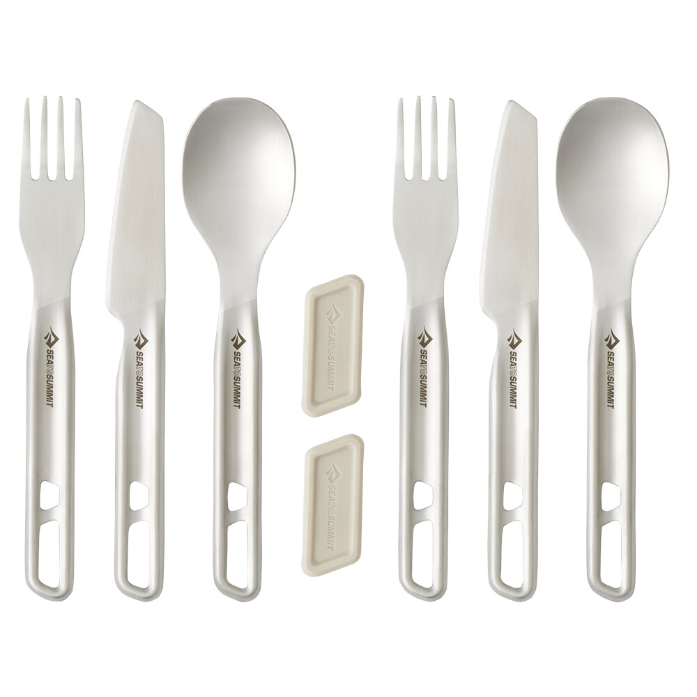 Set de tacâmuri pentru două persoane din gama Detour de la Sea To Summit, realizat din oțel inoxidabil de înaltă calitate. Include două linguri, o furculiță și un cuțit. De asemenea, este inclus un suport magnetic din silicon, astfel încât să puteți arunca pur și simplu tacâmurile în rucsac sau geantă și totul rămâne împreună, plus fără zăngănit enervant. Potrivit pentru călătorii și mâncarea de zi cu zi.