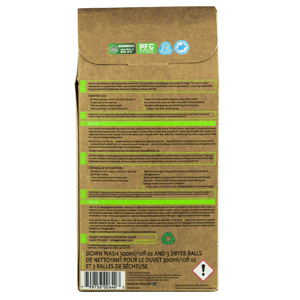 Grangers Liquid Down Wash Kit îndepărtează ușor murdăria și mirosul, păstrând în același timp materialul impermeabil și respirabil. Trei bucăți de bile de uscare din lână, previn aglomerarea penelelor în timpul uscării. Acest lucru îl va menține perfect "pufos" și va da din nou volum echipamentului dvs.