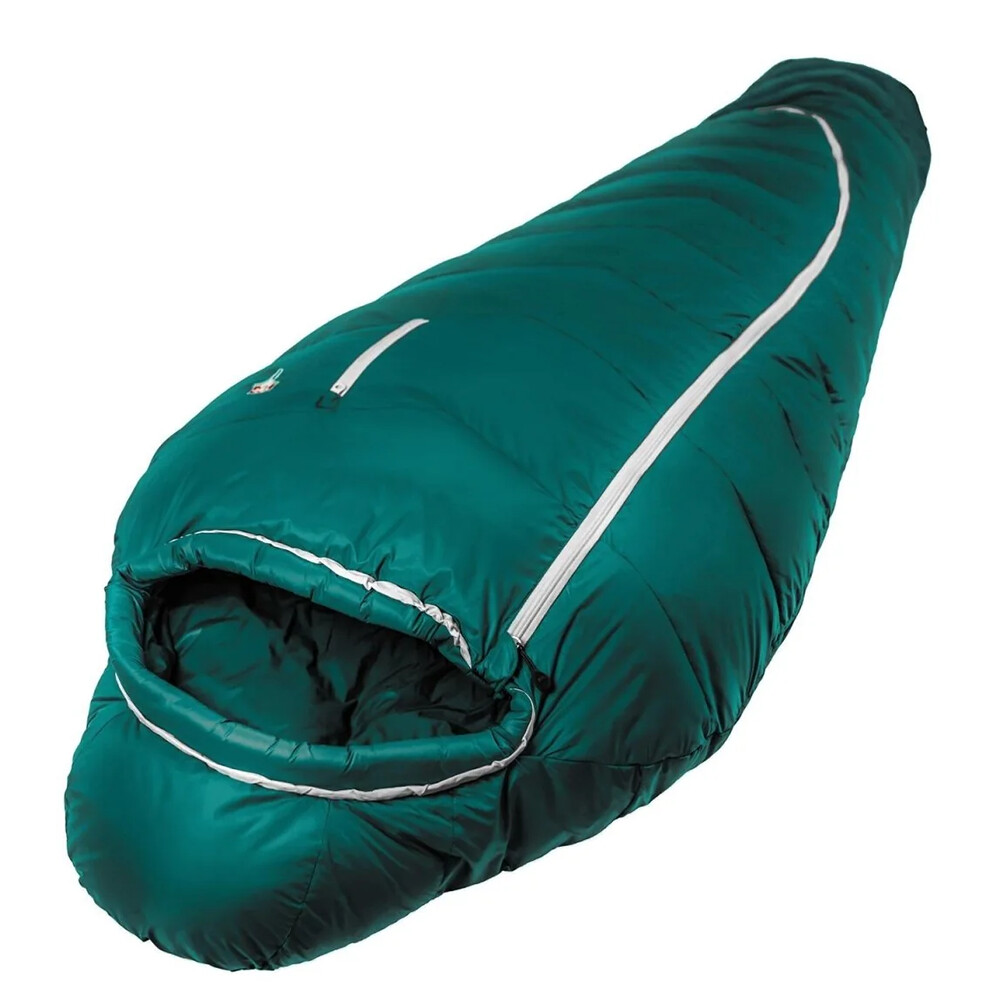 Sac de dormit pentru trei anotimpuri cu umplutură combinată din pană de rață și lână. Acest lucru îl face rezistent la umiditate, ușor și foarte confortabil termic.