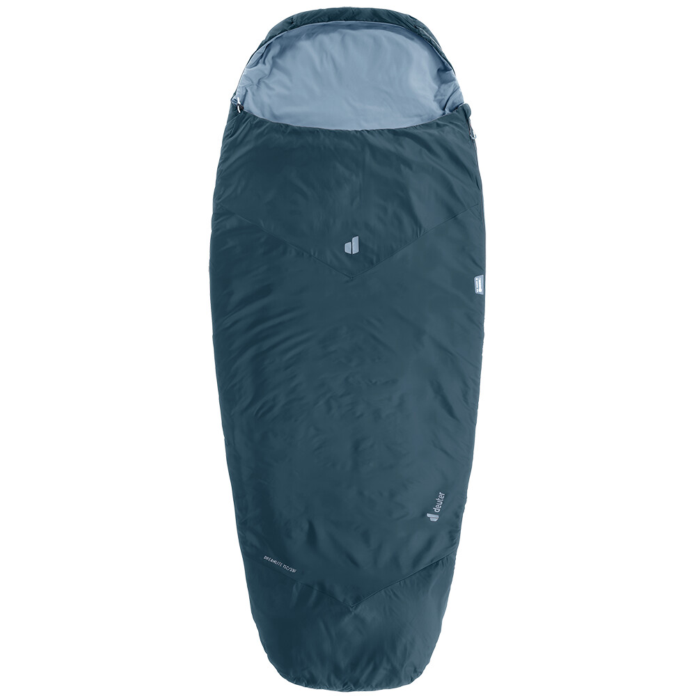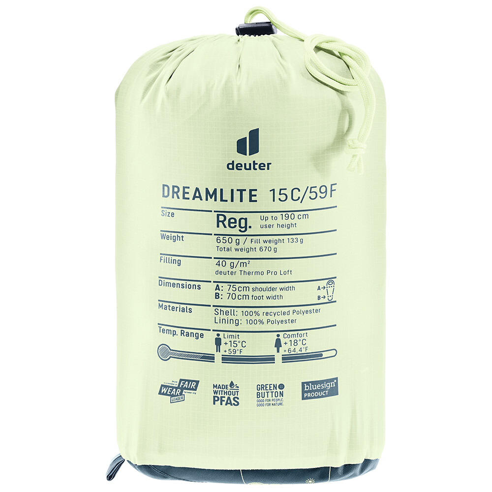 DreamLite 15 este un sac de dormit de la deuter conceput pentru aventurile de vară. Este ușor și de dimensiuni reduse atunci când este împachetat. Este complet închis cu fermoar, astfel încât îl puteți folosi și ca pătură. Forma sa ovală oferă spațiu generos, pe care îl veți aprecia dacă vă mișcați mai mult în somn sau vă place să dormiți pe o parte. Este fabricată din materiale reciclate și este, de asemenea, ușor de curățat și de spălat datorită umpluturii sintetice.