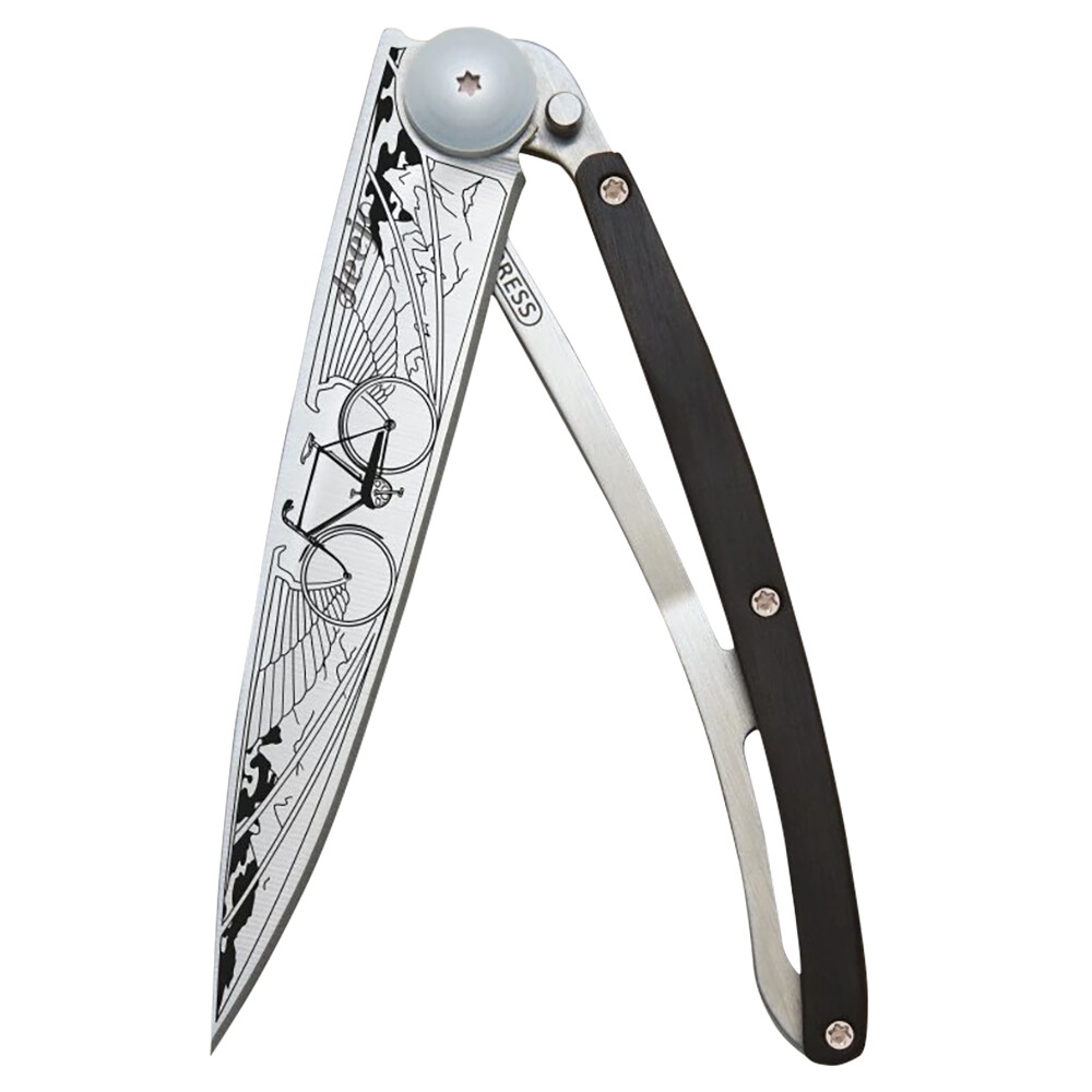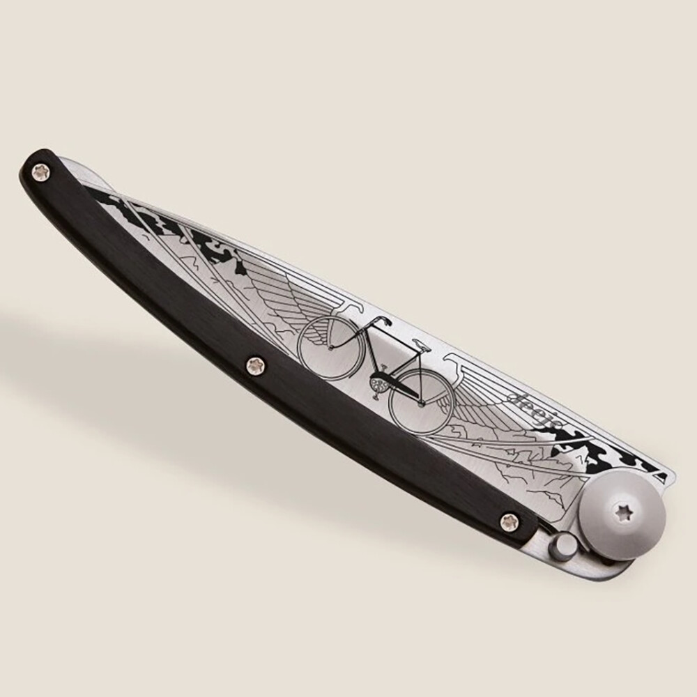 Brandul Deejo s-a născut din dorința de a reînvia plăcerea de a deține un cuțit de buzunar. Designul original, forjat cu laser, cu motive cicliste pe lamă, ridică cuțitul la rang de accesoriu personal sau cadou special. În plus, întotdeauna realizat din materiale nobile, cu încuietoare de siguranță și clip de curea. Teaca este realizată din lemn exotic de granadilla, care provine din copaci ce cresc în Africa. Acesta se remarcă prin duritate, oleozitate și culoare închisă, albastru-negru.