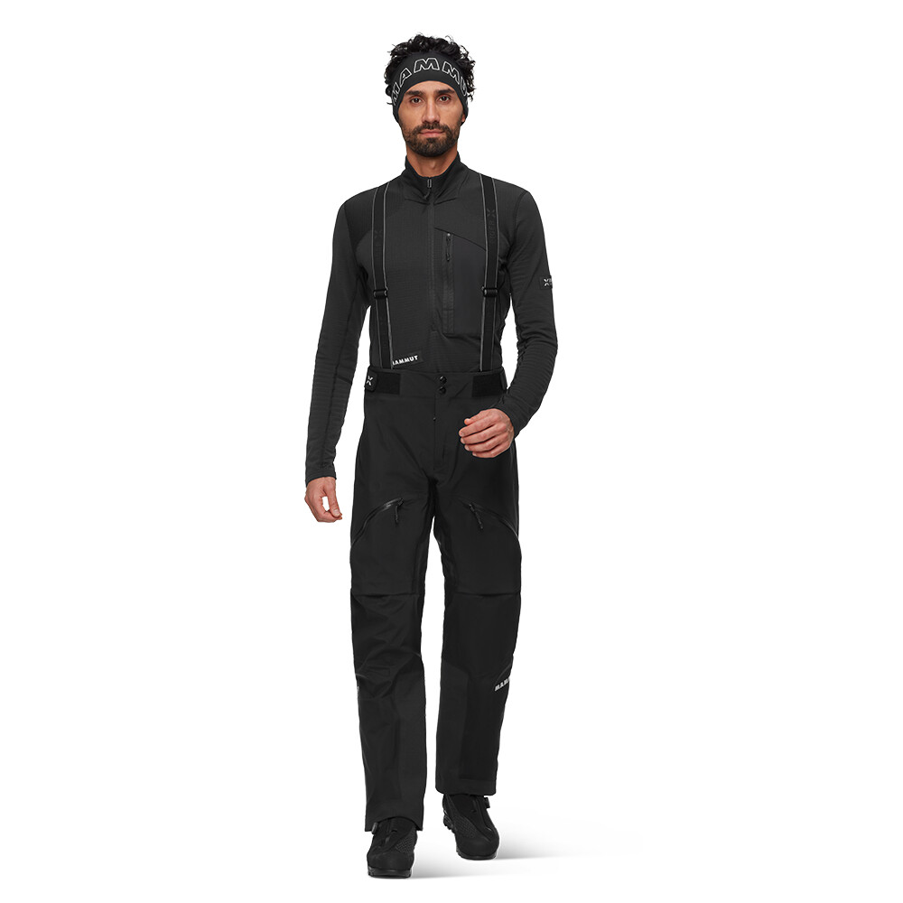 Pantalonii sunt realizați din GORE-TEX Pro în 3 straturi, cu o membrană ePE fără PFC. Acest lucru face ca pantalonii să fie extrem de rezistenți la vânt, apă și abraziune, rămânând în același timp respirabili. Croiala sofisticată și detaliile elaborate asigură confort și funcționalitate la alpinism. Pantalonii au un panou dorsal ridicat pentru protecție suplimentară și bretele reglabile și detașabile. Cu închizători practice Velcro la talie, pantalonii se potrivesc perfect. Fermoarele laterale permit reglarea temperaturii. Buzunarele frontale sunt accesibile chiar și atunci când purtați un ham de alpinism. Reflector RECCO® integrat crește șansele de salvare în caz de urgență.