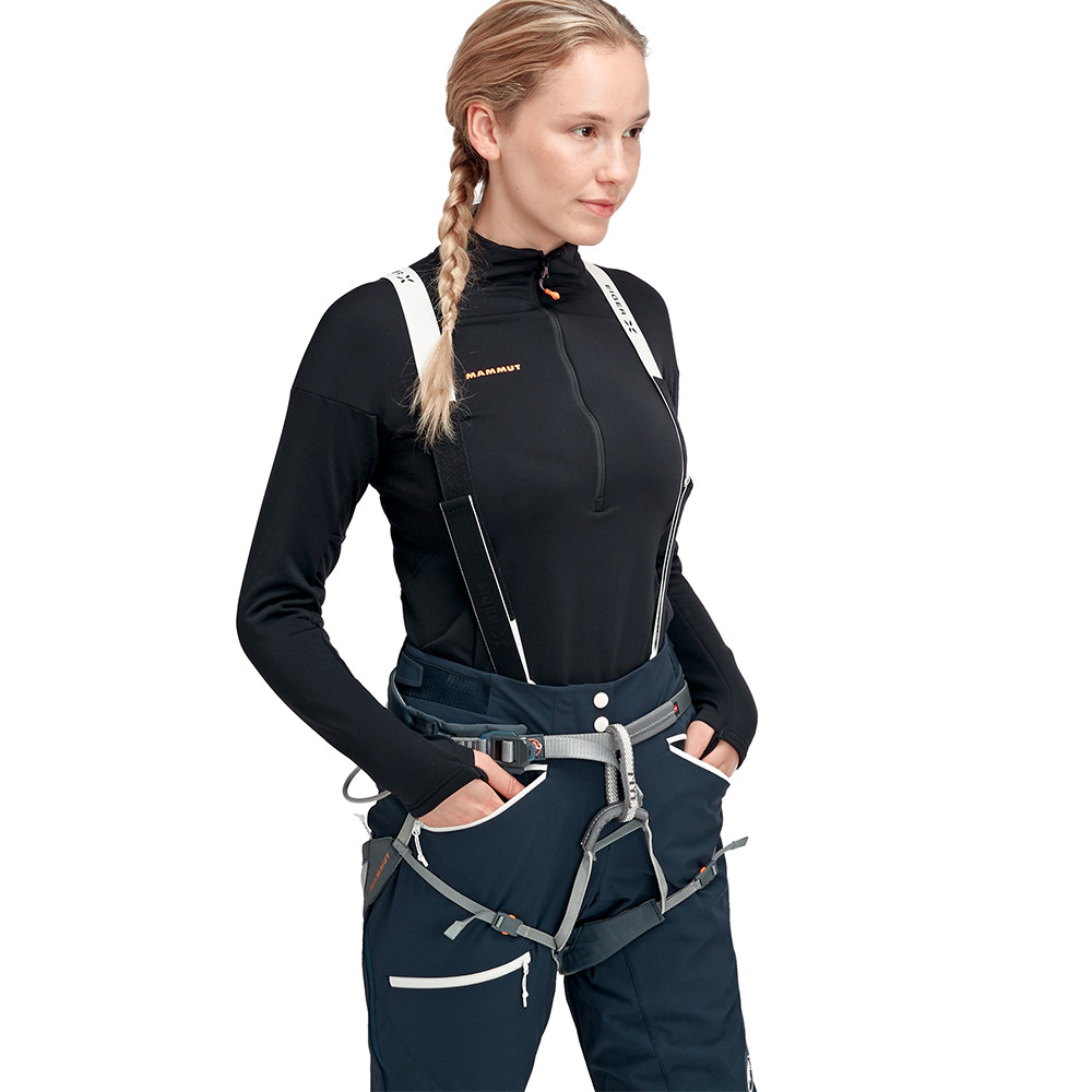 Pantalonii au protecție internă împotriva zăpezii, care este detașabilă și reglabilă prin intermediul unui fermoar cu închizătoare pentru cizme. Întărirea cu material Dyneema® protejează picioarele de tăierea de crampoane. Lățimea pantalonilor poate fi ajustată cu Velcro.