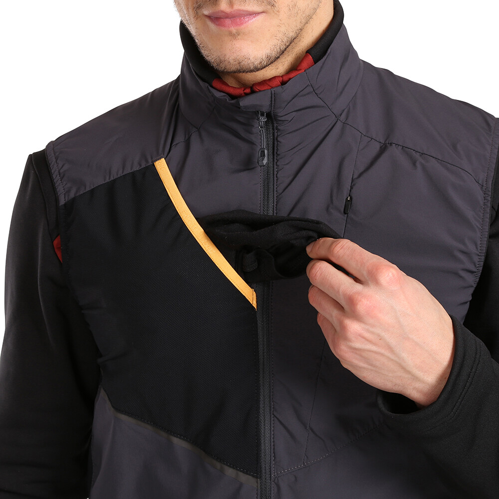 Vesta izolată pentru bărbați, rezistentă la vânt. Materialul exterior Pertex Quantum Air este completat cu material elastic în părțile laterale, care sporește confortul în timpul activității sportive și mai ales respirabilitatea.