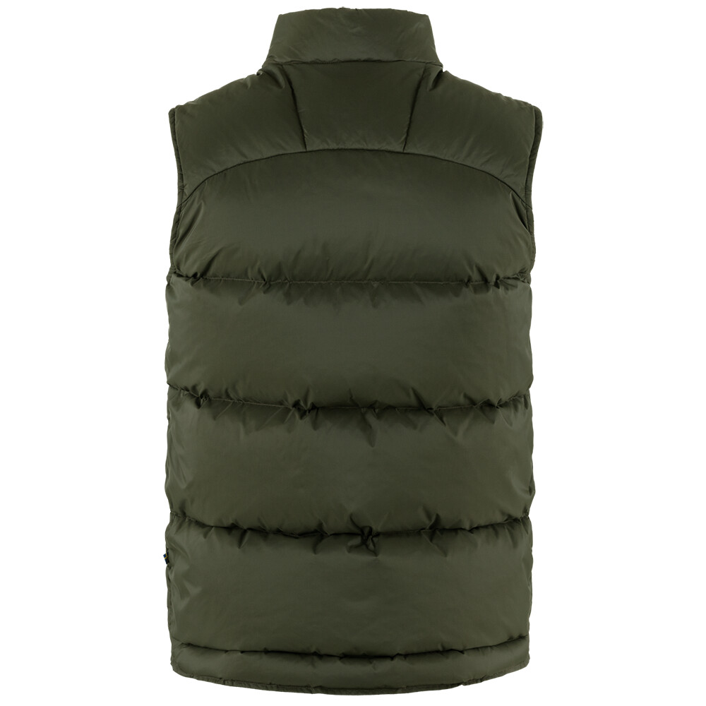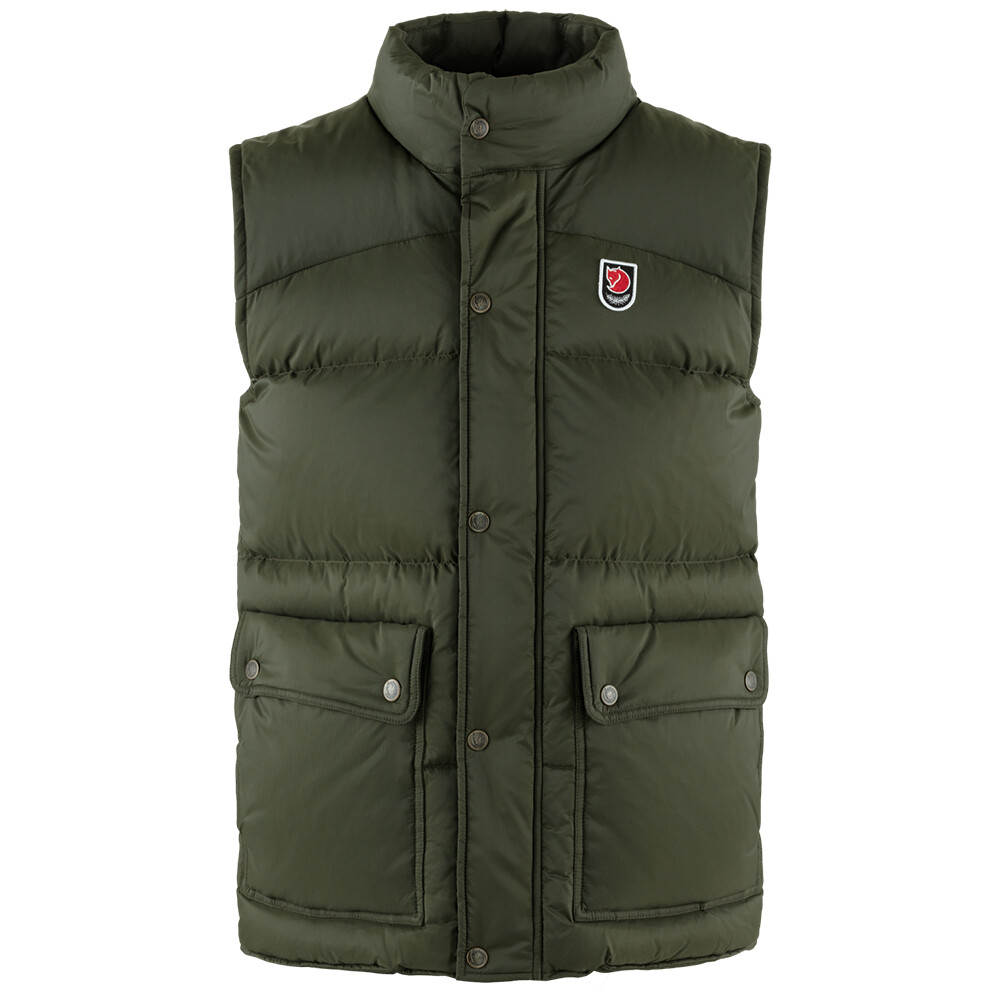 Vesta de puf pentru bărbați Fjällräven este potrivită pentru uzura zilnică sau pentru diverse activități sportive în condiții mai reci. Două buzunare de mână și un buzunar pe piept cu închidere cu buton.