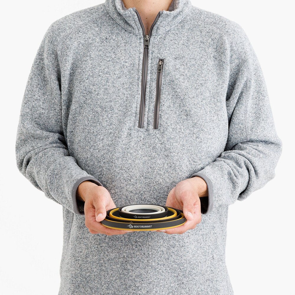 Set de mese de călătorie de la Sea To Summit fabricat din silicon alimentar pentru depozitare maximă. Setul potrivit pentru o persoană include un castron mic și mare și o cană. Toate sunt potrivite pentru băuturi/alimente calde și reci. Când sunt pliate, ustensilele ocupă un spațiu minim și datorită profilului lor redus, nici nu veți ști că sunt în rucsac.