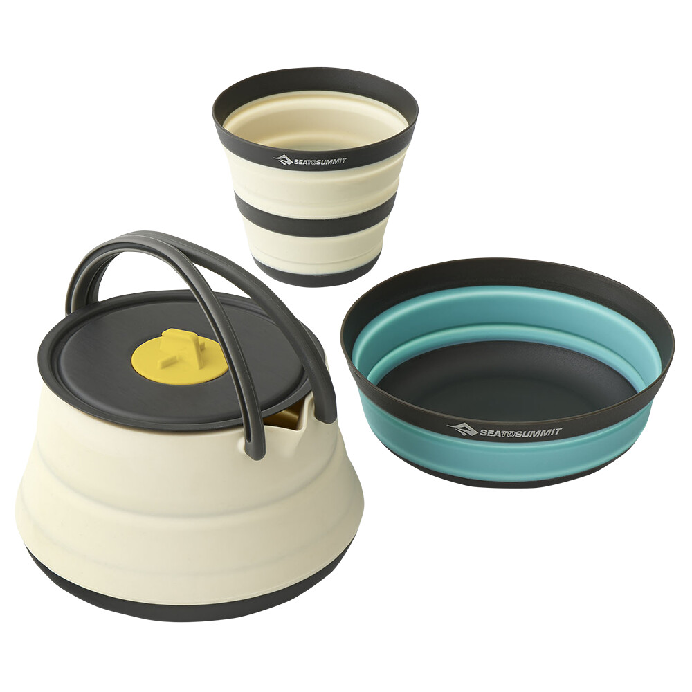 Un set de gătit pentru o singură persoană de la Sea to Summit, din seria Frontier de ustensile de gătit pliabile ultraușoare din silicon. Acesta va încânta toți fanii călătoriilor ușoare și fanii echipamentului minimalist. Setul include un ceainic de 1,3 litri, o cană și un castron. Ceainicul are fundul din aluminiu anodizat, astfel încât îl puteți folosi cu ușurință pe o sobă de drumeție pe gaz sau pe o sobă electrică. Îl puteți folosi pentru a prepara apă pentru băuturi calde și alimente uscate, dar funcționează și ca oală pentru porții mai mici de alimente gătite. Atunci când este pliat, întregul set va ocupa aproximativ la fel de mult spațiu în rucsac ca un powerbank pentru exterior.