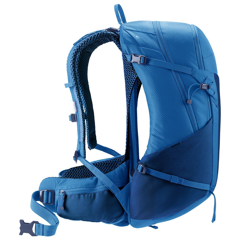Rucsac ușor pentru drumeții cu un buzunar principal cu acces frontal și capac rulant superior. Are buzunare din plasă pe curelele de umăr și pe centura de talie. Compatibil cu hidrovac, cu posibilitatea de a atașa bețe.