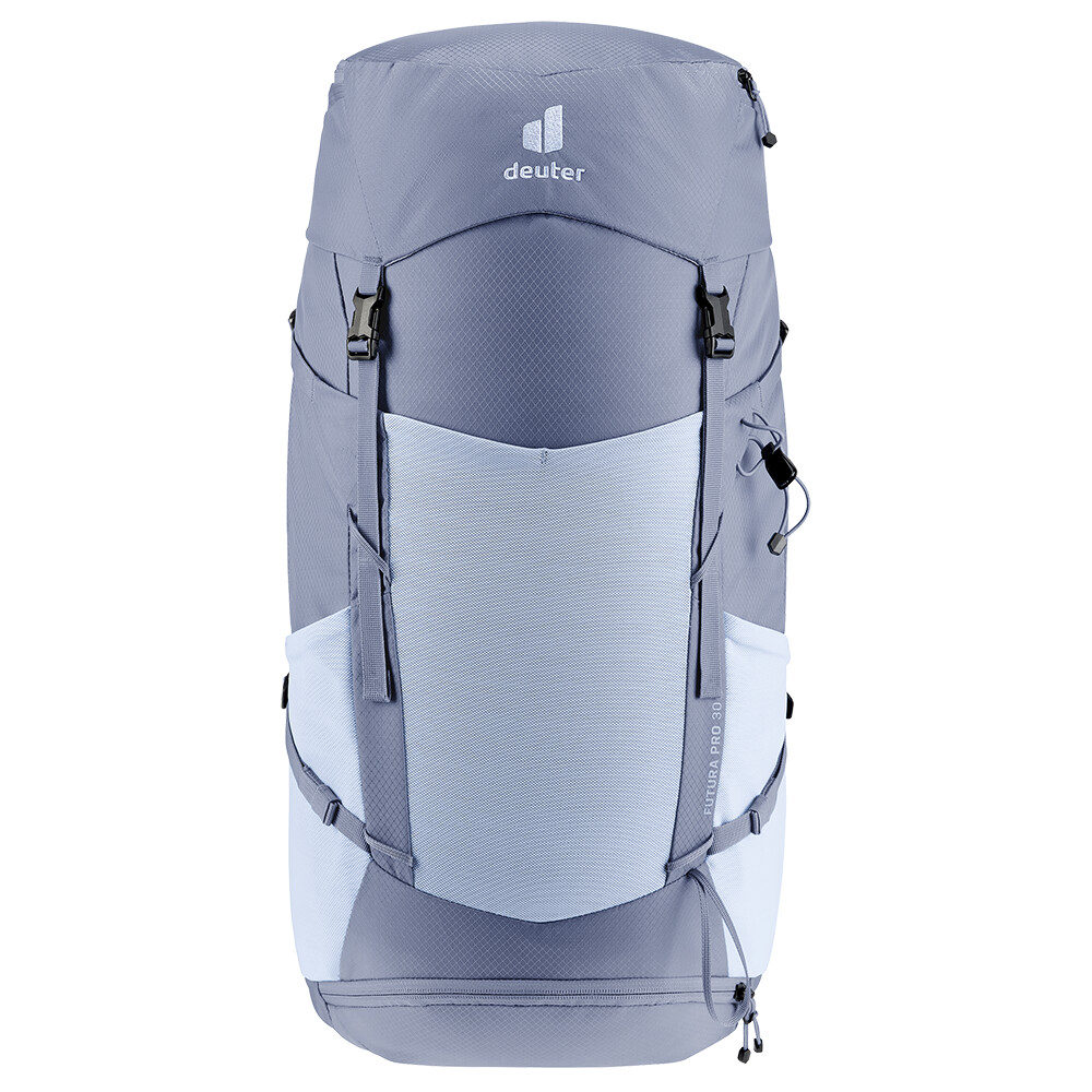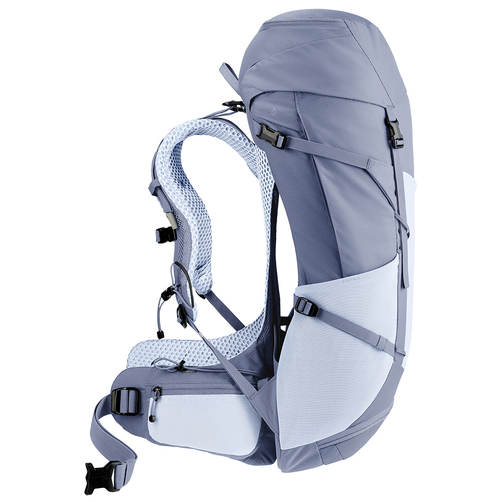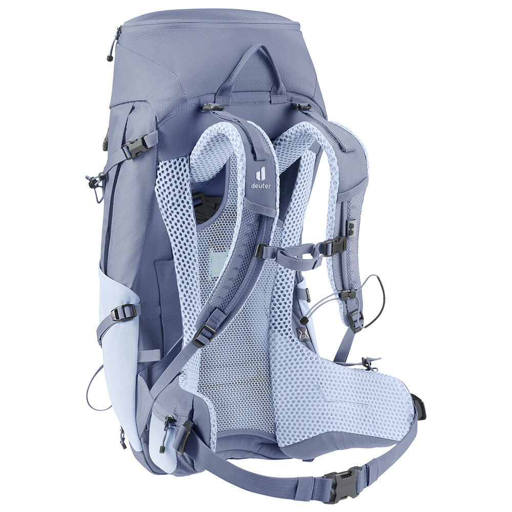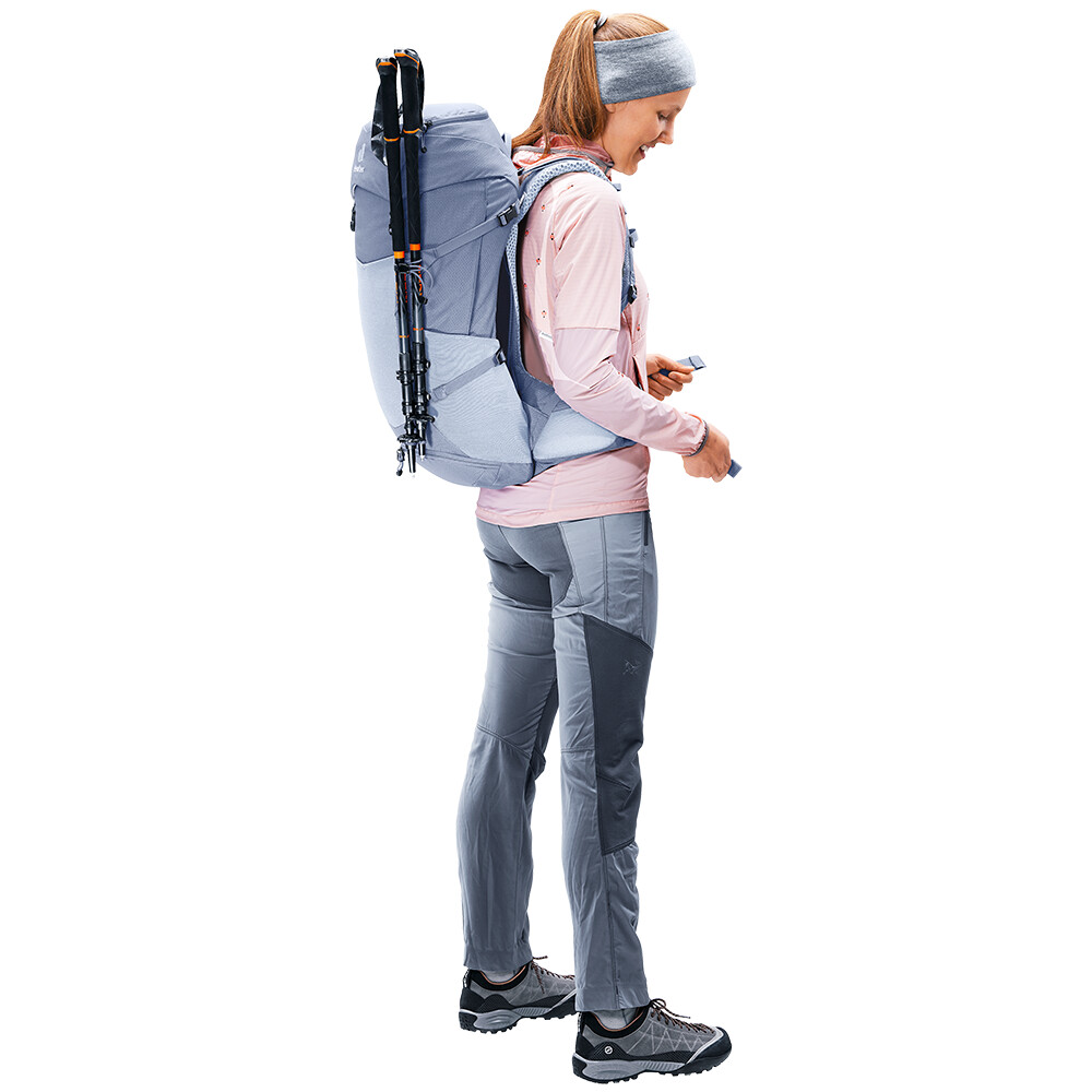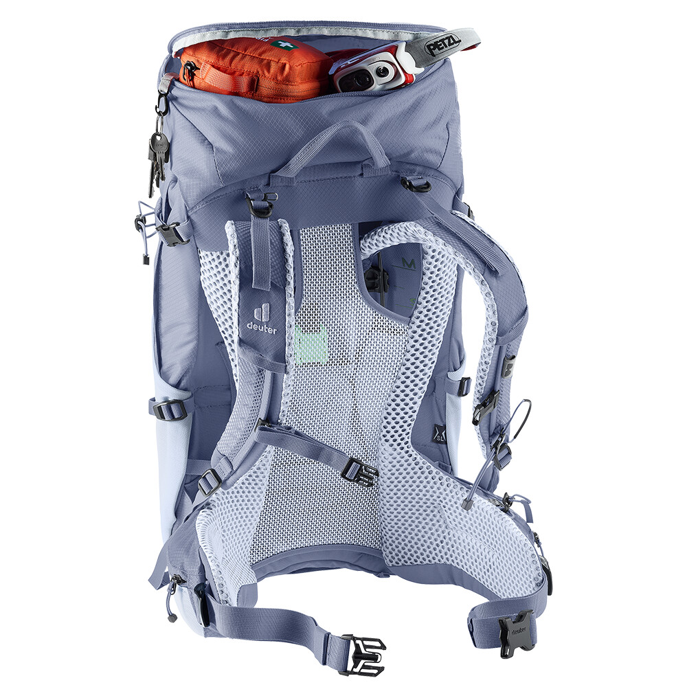 Rucsacul Futura Pro 30 SL de la deuter va fi un companion minunat în călătoriile dvs. de explorare, fie că este vorba de drumeții pe munte sau doar de rătăciri prin pădure. Futura are un sistem de spate format din armătură metalică cu plasă și umplutură în jurul coloanei vertebrale. Acest lucru asigură o respirabilitate maximă și o distribuție optimă a greutății între umeri și șolduri. În plus, gama Futura Pro dispune de sistemul VariClick, care vă permite să reglați una dintre cele cinci lungimi specifice ale spatelui. Deoarece rucsacul este conceput pentru drumeții de toate tipurile, acesta oferă posibilitatea de a atașa bețe, un piolet, un suport pentru cască și include, de asemenea, un capac de ploaie. Pentru claritate în echipamentul împachetat, rucsacul are două compartimente separabile care pot fi combinate într-un compartiment mare, dacă este necesar.