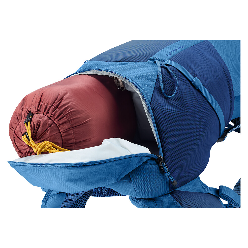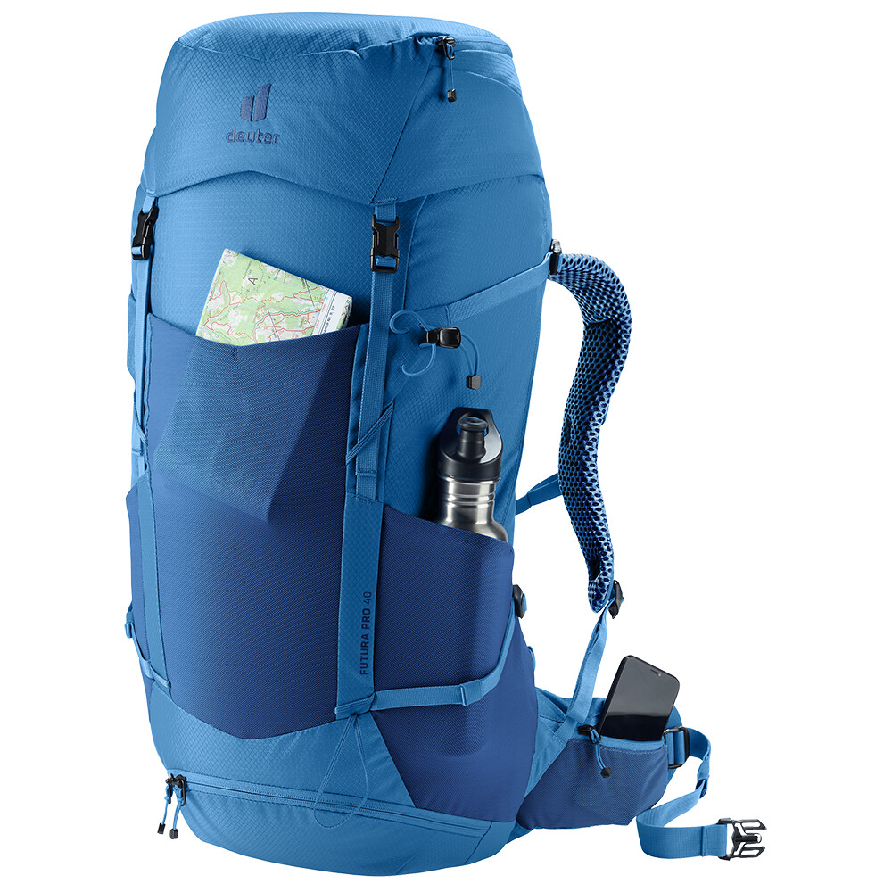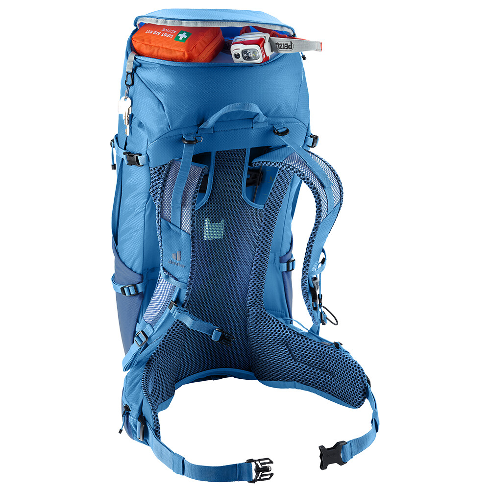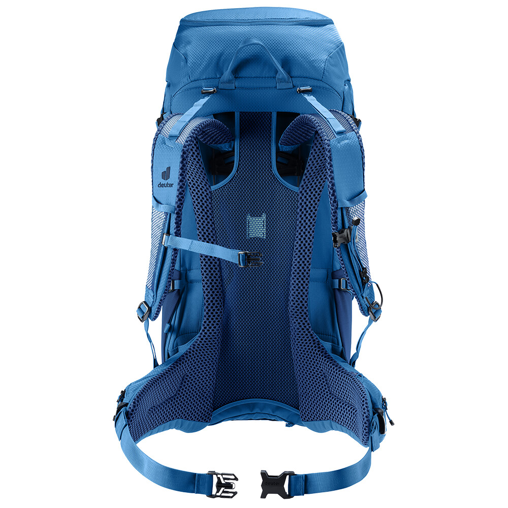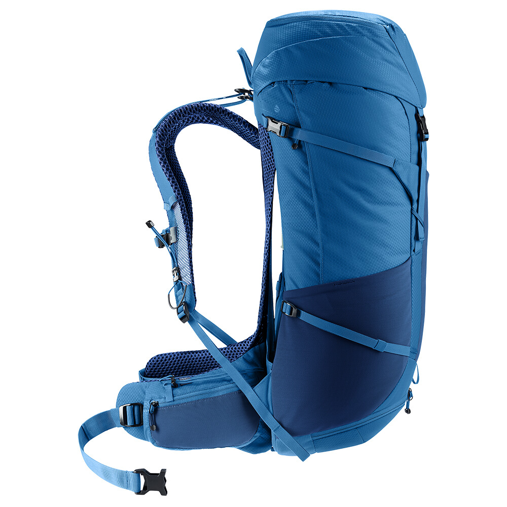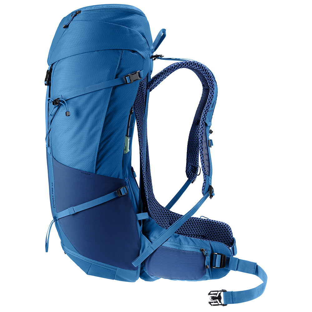 Rucsacul Futura Pro 40 de la deuter va fi un companion excelent pentru explorare, fie că este vorba de drumeții pe munte sau doar de rătăciri prin pădure. Futura are un sistem de spate format din armătură metalică cu plasă și umplutură în jurul coloanei vertebrale. Acest lucru asigură o respirabilitate maximă și o distribuție optimă a greutății între umeri și șolduri. În plus, gama Futura Pro dispune de sistemul VariClick, care vă permite să reglați una dintre cele cinci lungimi specifice ale spatelui. Deoarece rucsacul este conceput pentru drumeții de toate tipurile, acesta oferă posibilitatea de a atașa bețe, un piolet, un suport pentru cască și include, de asemenea, un capac de ploaie. Pentru claritate în echipamentul împachetat, rucsacul are două compartimente separabile care pot fi combinate într-un compartiment mare, dacă este necesar.