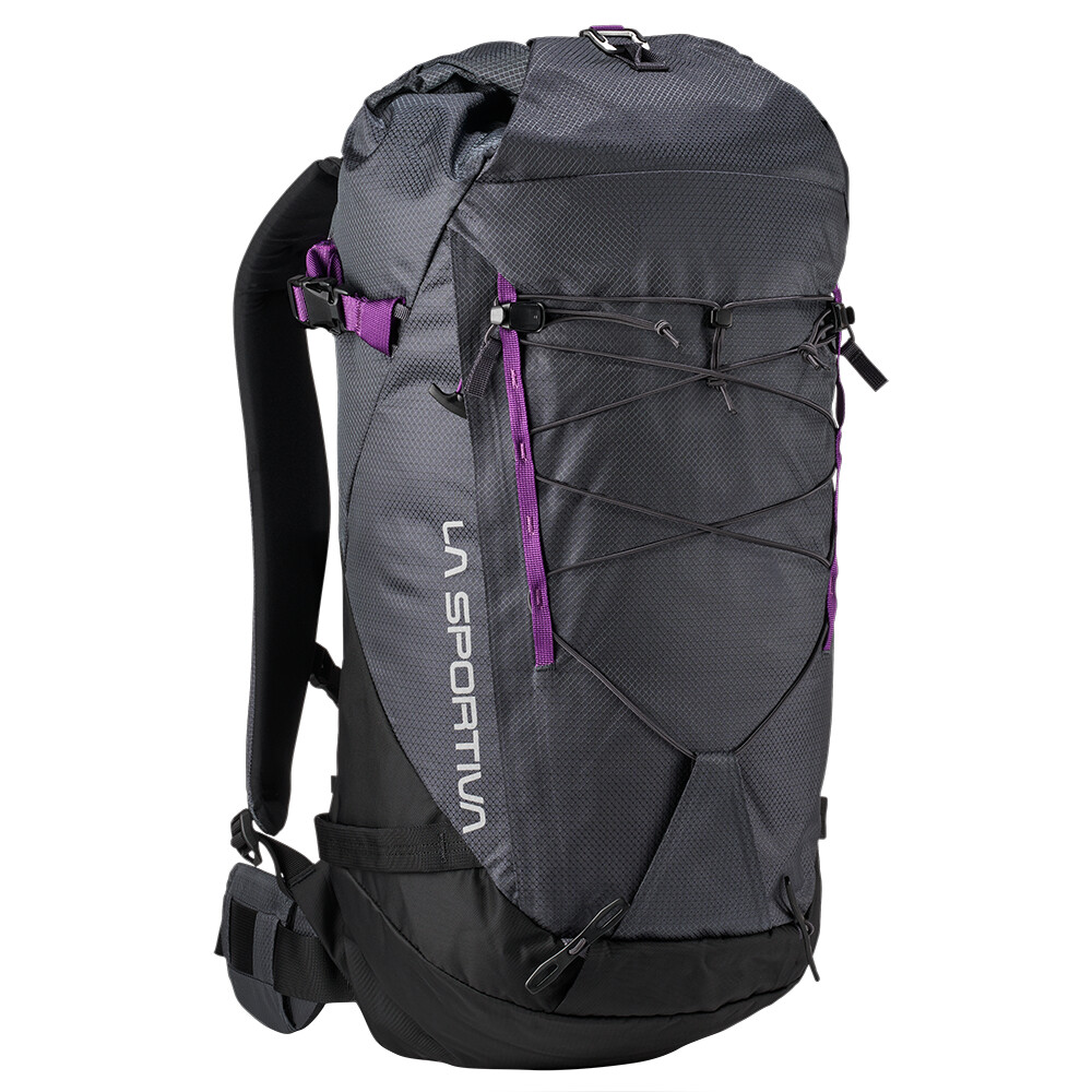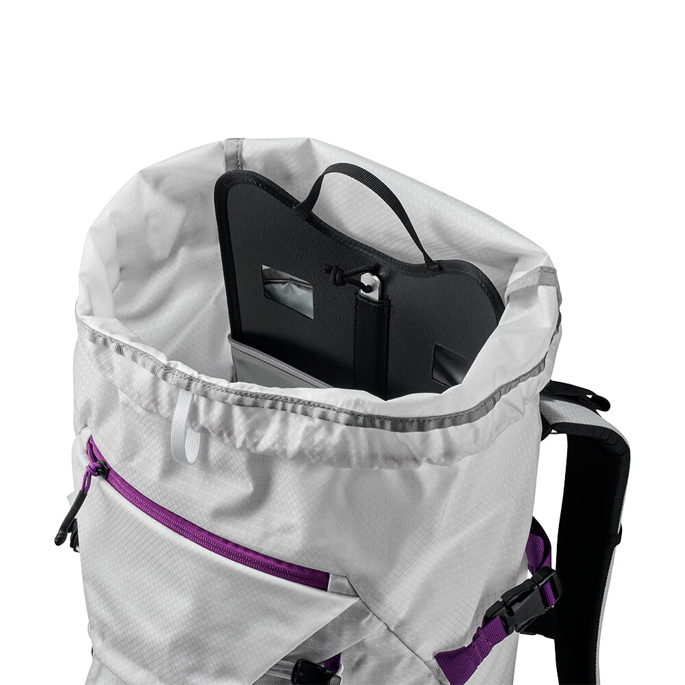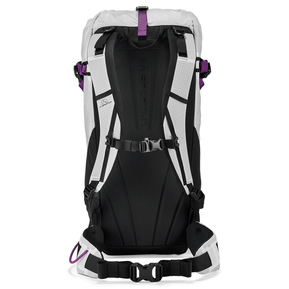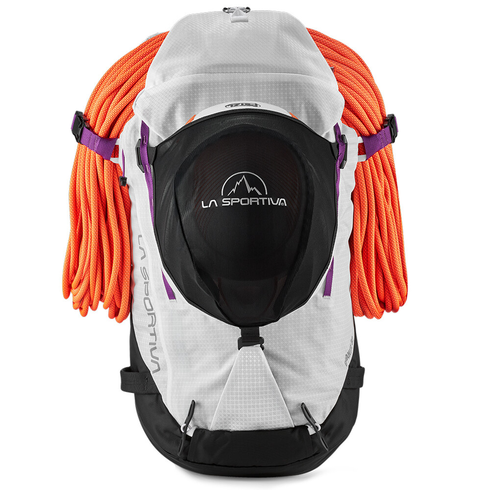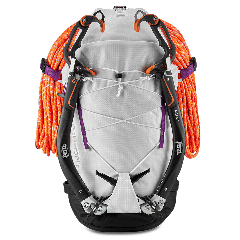 Rucsac de alpinism cu închidere superioară roll-top și intrare laterală cu fermoar. Poate transporta frânghie, pioleți, bețe și bucle pentru suport pentru cască. Dispune de un spate din spumă conturată, curea reglabilă pentru piept și talie.