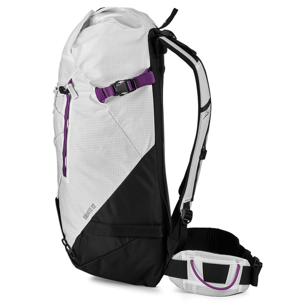 Rucsacul Granite 32 de la La Sportiva va fi partenerul perfect pentru aventurile tale de alpinism și drumeții pe munte, pe tot parcursul anului. Este fabricat din material foarte durabil, iar croiala sa vă permite să vă deplasați confortabil și versatil. Are o intrare superioară cu o închidere cu cataramă rulantă și o extensie pe care o puteți folosi pentru a împacheta mai multe echipamente sau pentru a transporta o coardă. În plus, are și o intrare laterală cu fermoar pentru localizarea rapidă a uneltelor specifice. Panoul din spate este fabricat din spumă termoformată, cu ranforsare pentru o purtare confortabilă pe tot parcursul zilei. Pachetul poate fi echipat cu pioleți, bețe și o plasă pentru cască (suportul pentru cască nu este inclus). Curelele laterale vă permit, de asemenea, să transportați schiuri.