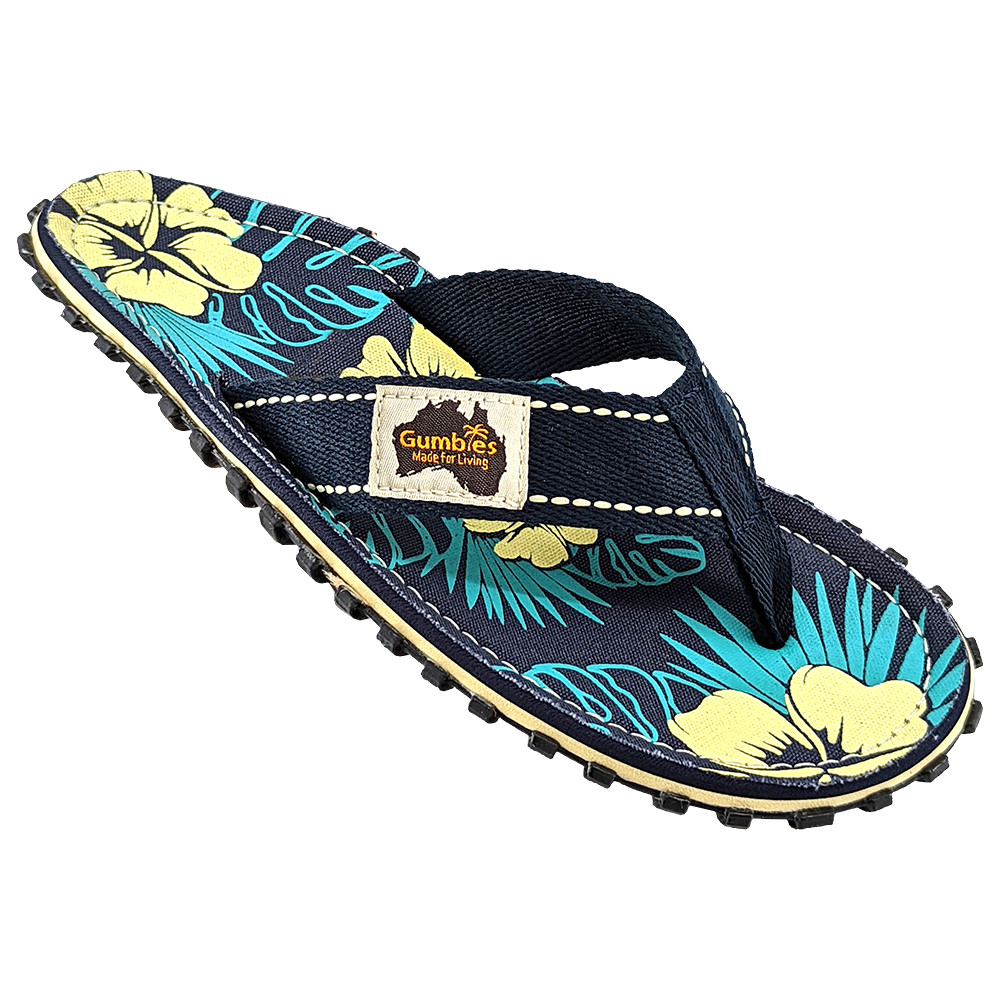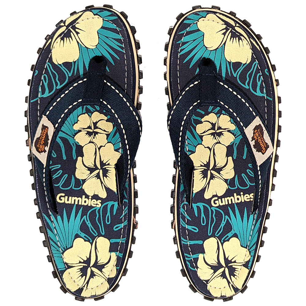 Gumbies Islander Blue Hibiscus sunt flip flop-uri eco&trendy elegante din Australia. Acestea au fost dezvoltate cu o pasiune pentru aer liber, călătorii și independență. Acestea oferă libertatea unui pantof minimalist, protejând în același timp piciorul cu o talpă robustă.