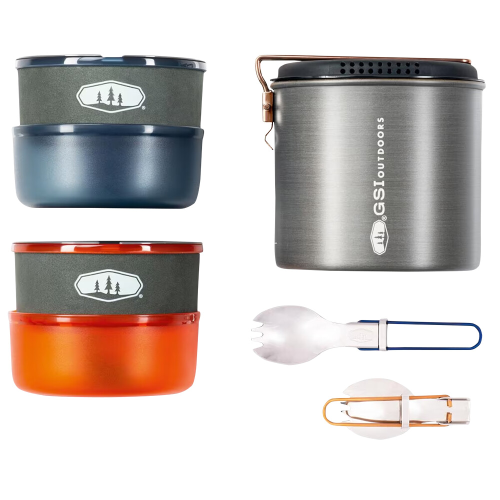 Setul de ustensile de gătit de la GSI conține tot ce aveți nevoie pentru gătit în aer liber sau pentru camping. Sunt incluse o oală de 1,8 litri cu capac, două boluri, două căni cu manșoane din neopren, două linguri pliabile (spork) și un recipient din material lipit rezistent pe care îl puteți folosi ca bazin. Oala are o pâlnie practică, un capac cu strecurătoare și un mâner pliabil. Întregul set poate fi împachetat perfect împreună, inclusiv un mic cartuș de gaz (220 g) și un aragaz. Acest lucru va economisi spațiu în rucsac atunci când sunteți într-o drumeție de mai multe zile, pe bicicletă sau călătoriți cu mașina sau motocicleta.