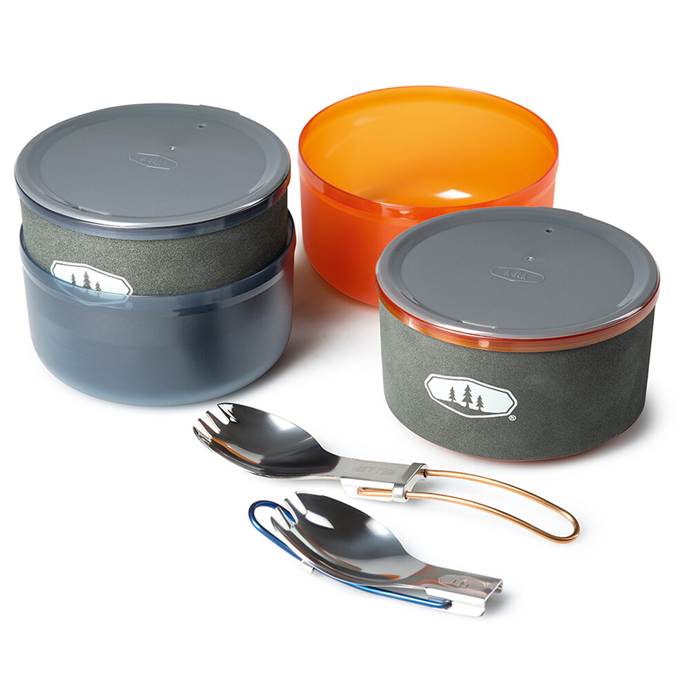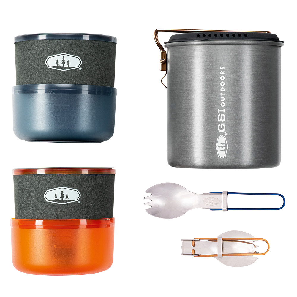 Setul de ustensile de gătit de la GSI conține tot ce aveți nevoie pentru gătit în aer liber sau pentru camping. Acesta include o oală cu capac de 1,4 litri, două boluri, două căni cu manșoane din neopren, două linguri pliabile (spork) și un recipient din material lipit rezistent pe care îl puteți folosi ca bazin. Vasul are o pâlnie practică, un capac cu strecurătoare și un mâner pliabil. Întregul set poate fi împachetat perfect împreună, inclusiv un mic cartuș de gaz (110 g) și un aragaz. Acest lucru va economisi spațiu în rucsac atunci când sunteți într-o drumeție de mai multe zile, pe bicicletă sau călătoriți cu mașina sau motocicleta.