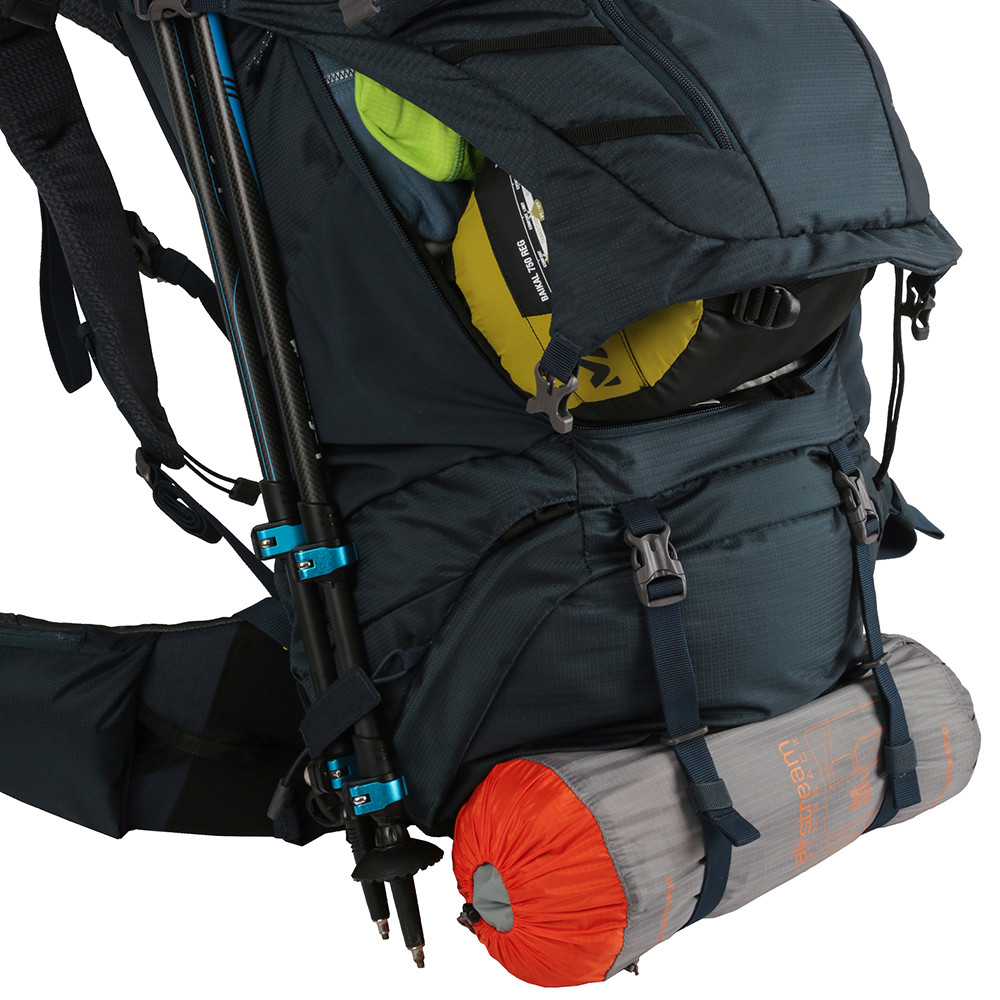 Rucsac ușor pentru drumeții cu buzunar principal cu acces frontal și capac rulant superior. Are buzunare din plasă pe curelele de umăr și o centură detașabilă. Compatibil cu hidrovac, posibilitate de a atașa bețe.