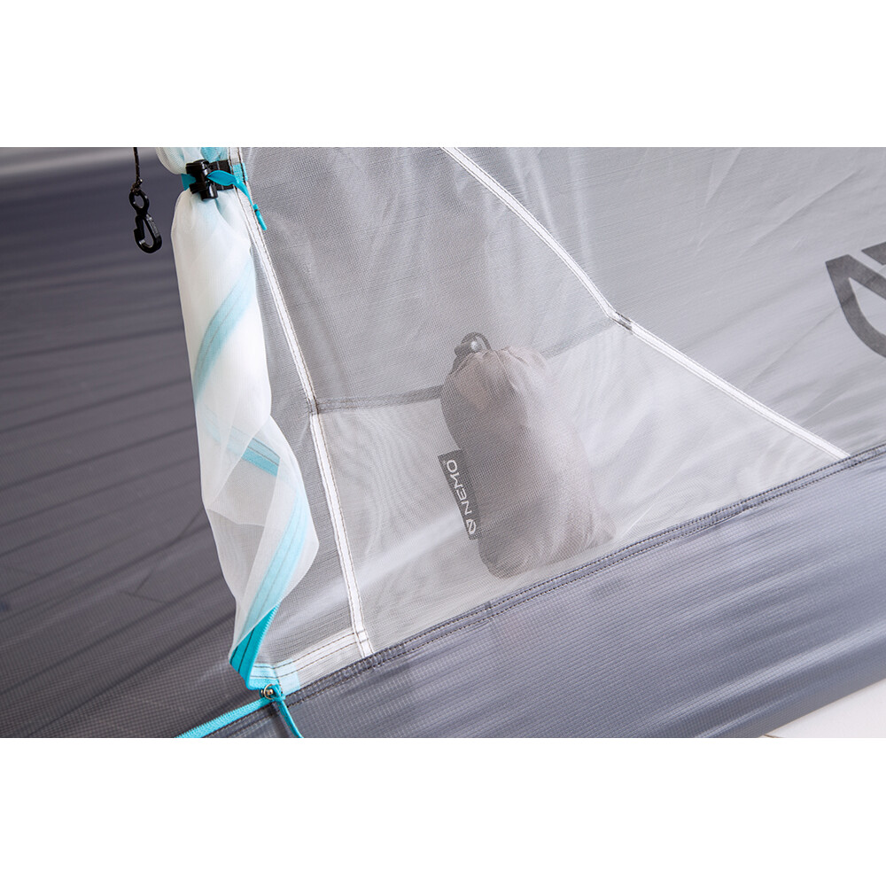 Cortul ultra-ușor Hornet Elite Osmo de la Nemo este cea mai bună alegere pentru toți fanii minimalismului, datorită greutății sale extrem de reduse și a pliabilității perfecte.Cortul ambalat fără stâlpi se potrivește în buzunarul inferior al rucsacului de drumeție, împreună cu sacul de dormit. Greutatea de numai 779 g nu diminuează confortul și spațiul interior. Datorită clipsurilor speciale Flybar™, înălțimea interioară este de 94 cm, astfel încât să vă puteți schimba sau împacheta confortabil lucrurile. În interiorul cortului, veți găsi o mulțime de buzunare pentru depozitarea echipamentului, inclusiv un compartiment special pentru o lampă frontală. Aceasta dispersează lumina uniform în tot spațiul, ca o lanternă. Intrarea cortului interior este realizată din plasă opacă, care oferă multă intimitate și acționează, de asemenea, ca o plasă de țânțari.