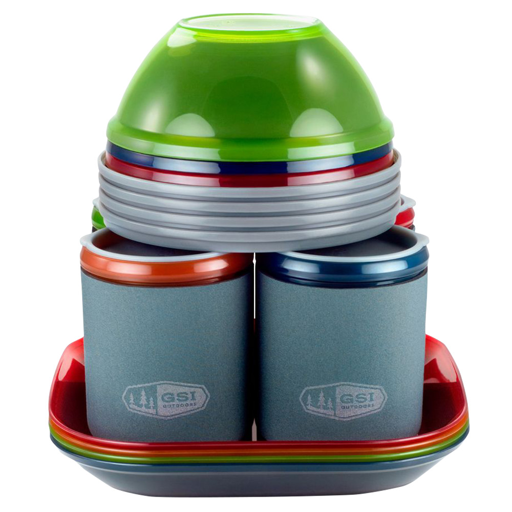 Set de masă mare pentru 4 persoane de la GSI, care include 20 de piese de veselă în 4 culori. Aici veți găsi boluri care includ capace pentru depozitarea resturilor, căni cu izolație din spumă EVA și capace pentru a preveni scurgerile, pahare, farfurii mari și o cutie de transport. Toate sunt fabricate din polipropilenă reciclabilă.