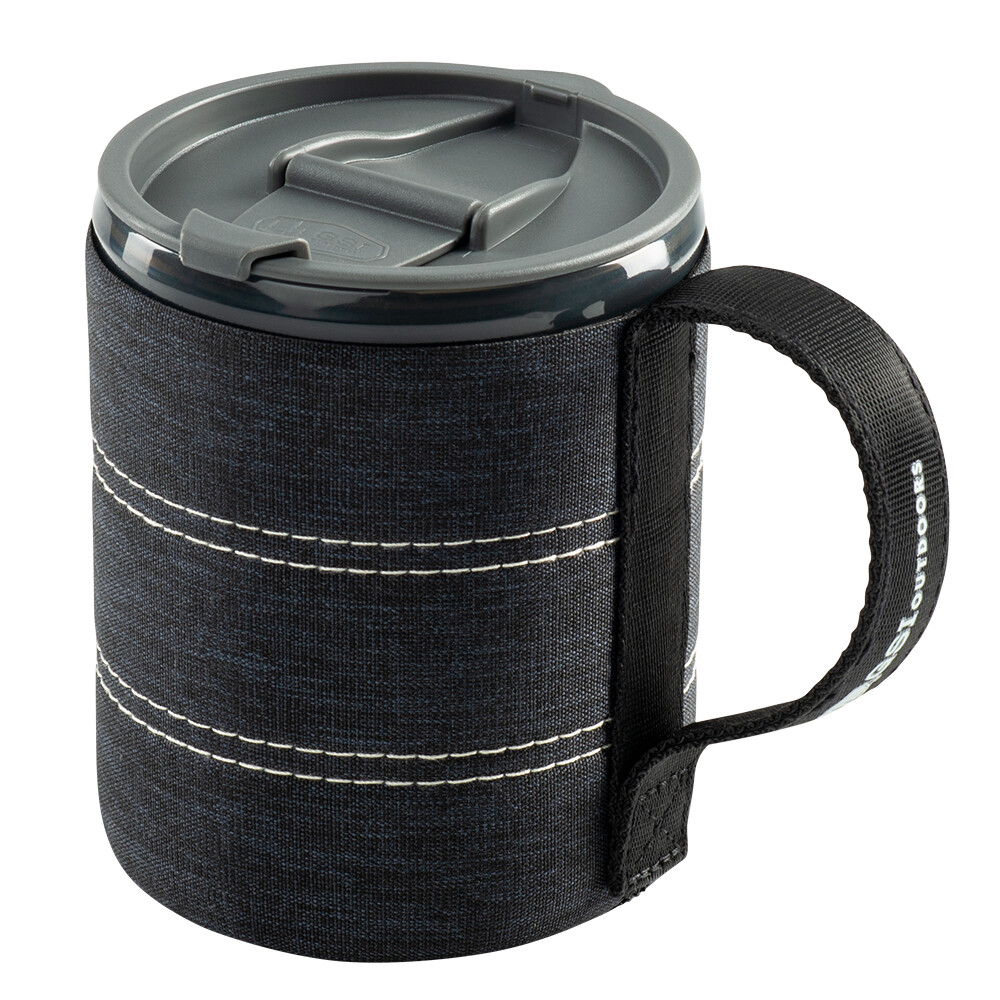 O cană ușoară de la GSI Outdoors care este fabricată din polipropilenă 100% reciclabilă. Această cană resigilabilă este protejată de un manșon textil.