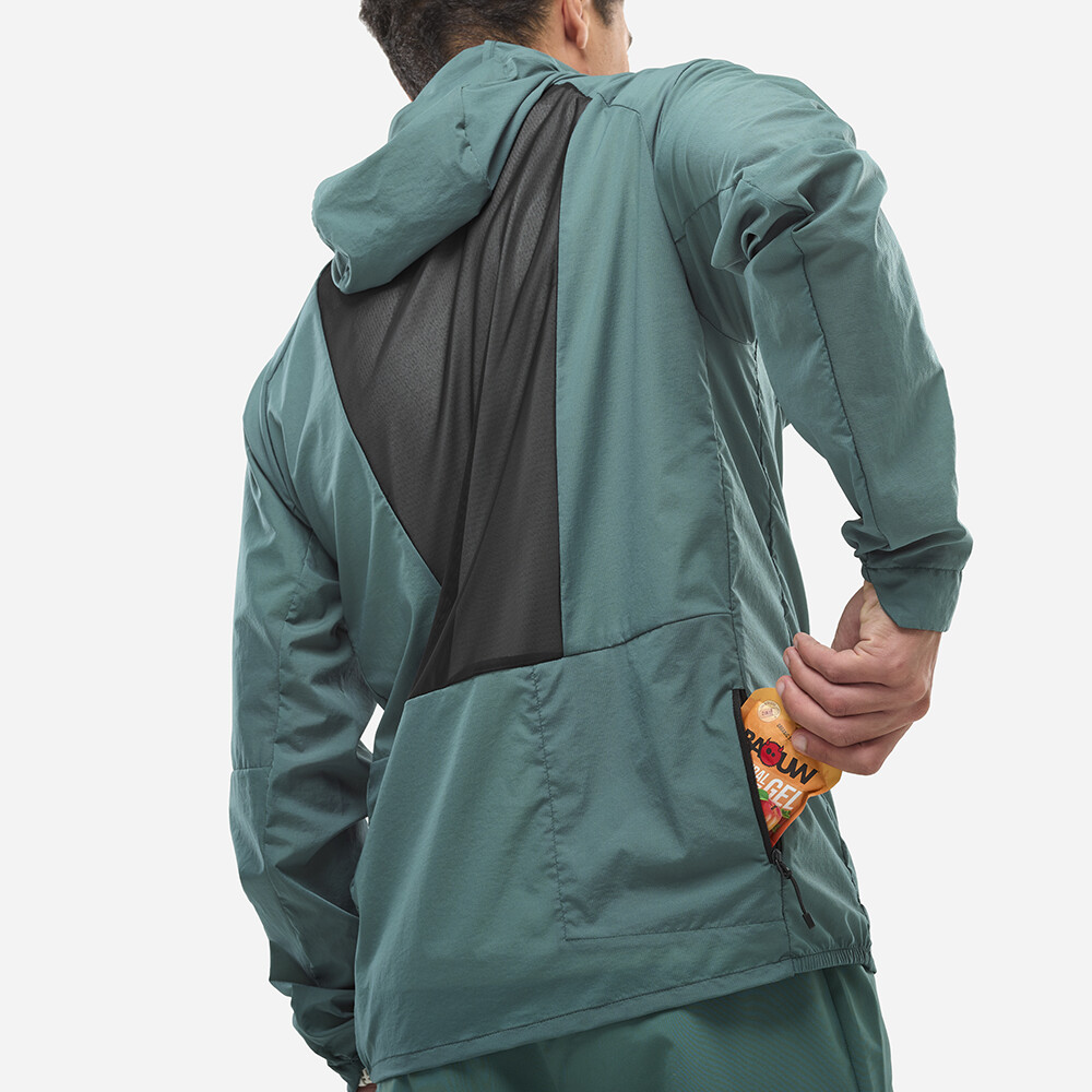 Spatele din plasă respirabilă asigură ventilație optimă și confort chiar și în timpul alergării intense. Materialul din poliamidă reciclată este durabil, hidrofug și foarte flexibil, astfel încât nu limitează mișcarea. Construcția minimalistă cu mâneci raglan promovează un pas natural, în timp ce finisajul elastic al glugii, mânecilor și tivului împiedică pătrunderea frigului. Jacheta este ușor pliabilă în propriul buzunar din spate, astfel încât să o aveți întotdeauna la îndemână atunci când vremea se schimbă brusc.