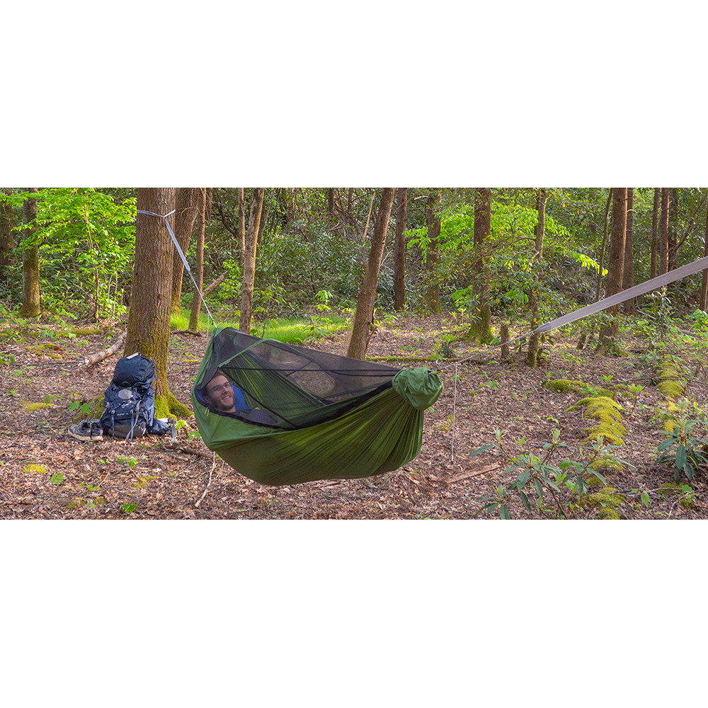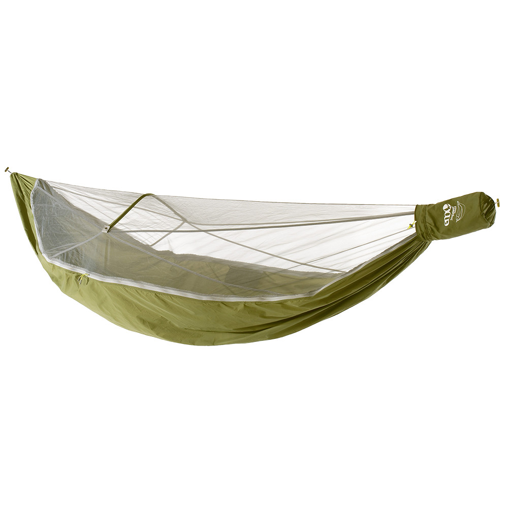 Lungimea extinsă vă permite să găsiți o poziție confortabilă, dreaptă atunci când vă culcați în diagonală. Plasa de țânțari integrată pentru un somn netulburat poate fi complet desfăcută și ascunsă în geanta de transport. Armătura încorporată în plasa de țânțari mărește spațiul interior, similar cu un cort. Toate acestea într-un pachet compact care cântărește o jumătate de litru de sticlă de apă.