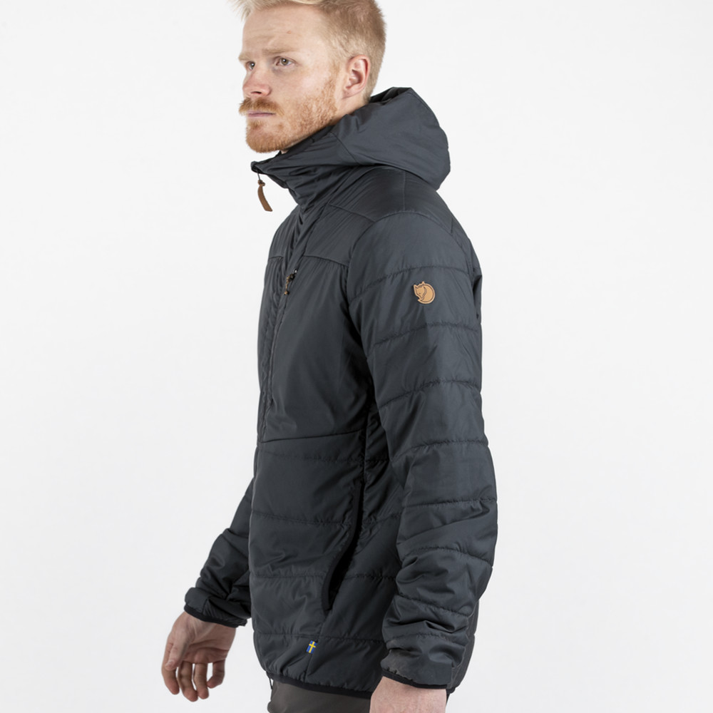 Jachetă izolată pentru bărbați de la Fjällräven, care are glugă reglabilă și mâneci modelate. Fixare cu crampoane la mâneci și cordon de strângere la tiv. Oferă un confort termic deosebit.