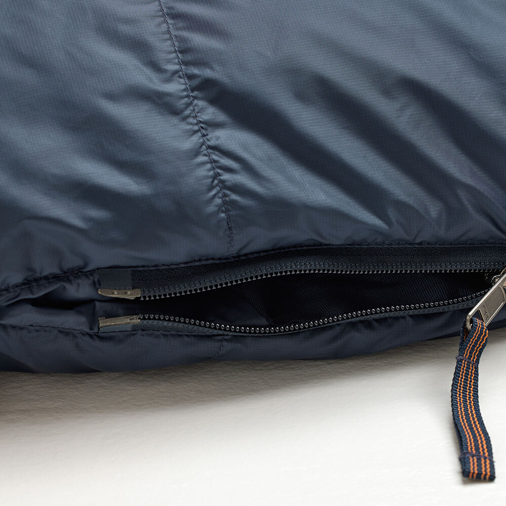 Sac de dormit pentru trei anotimpuri cu umplutură combinată din pană de rață și lână. Acest lucru îl face rezistent la umiditate, ușor și foarte confortabil termic.